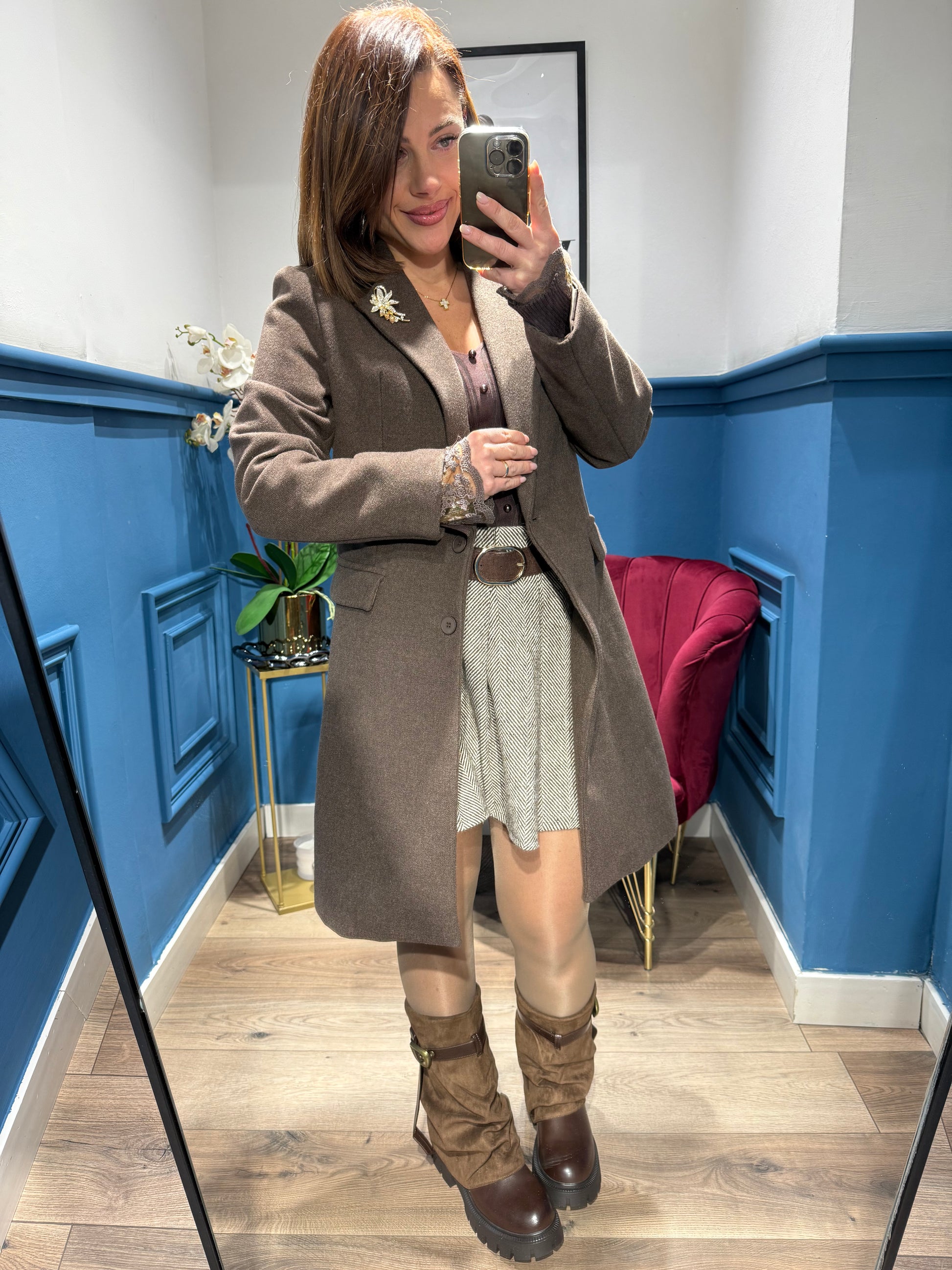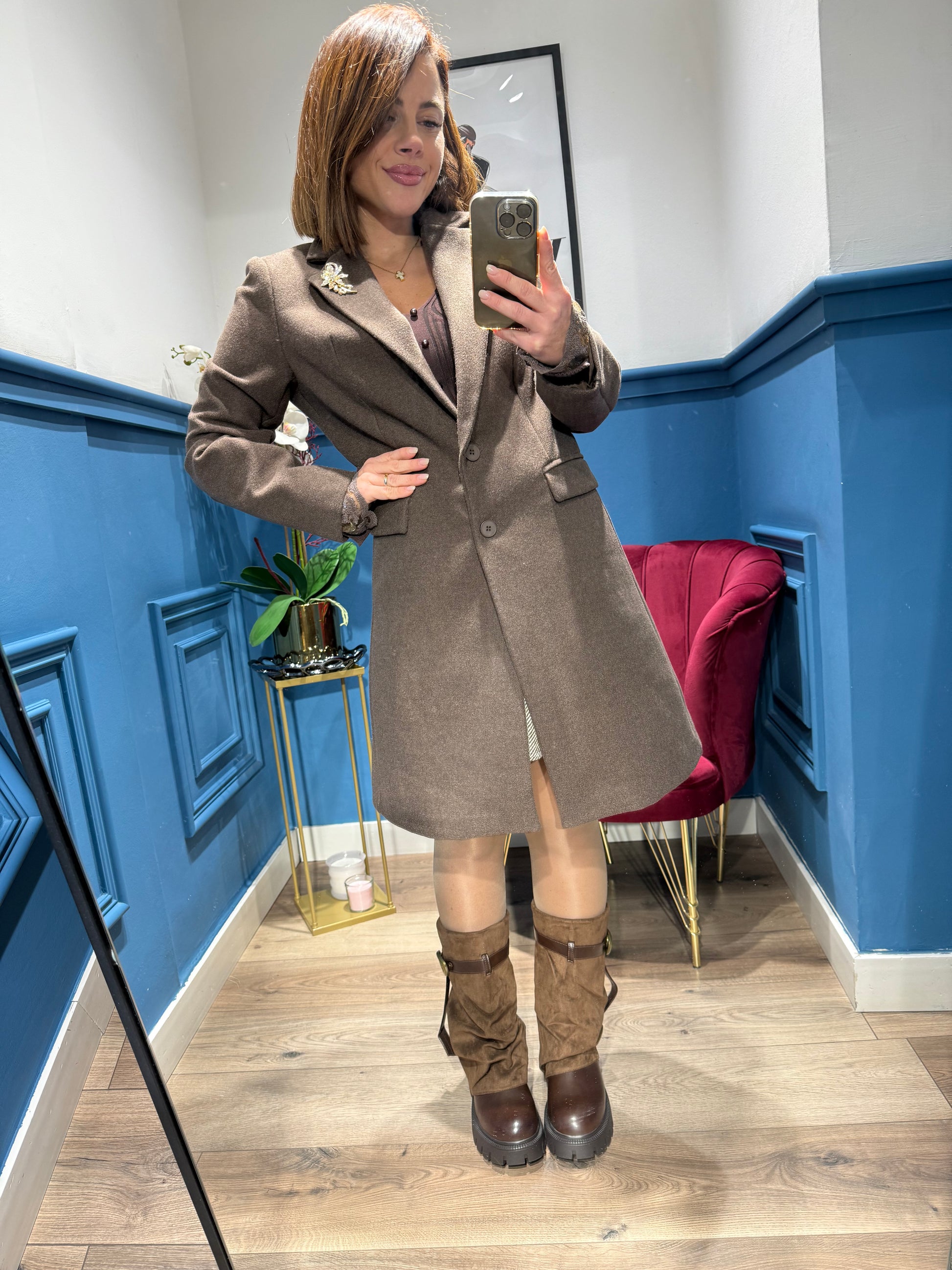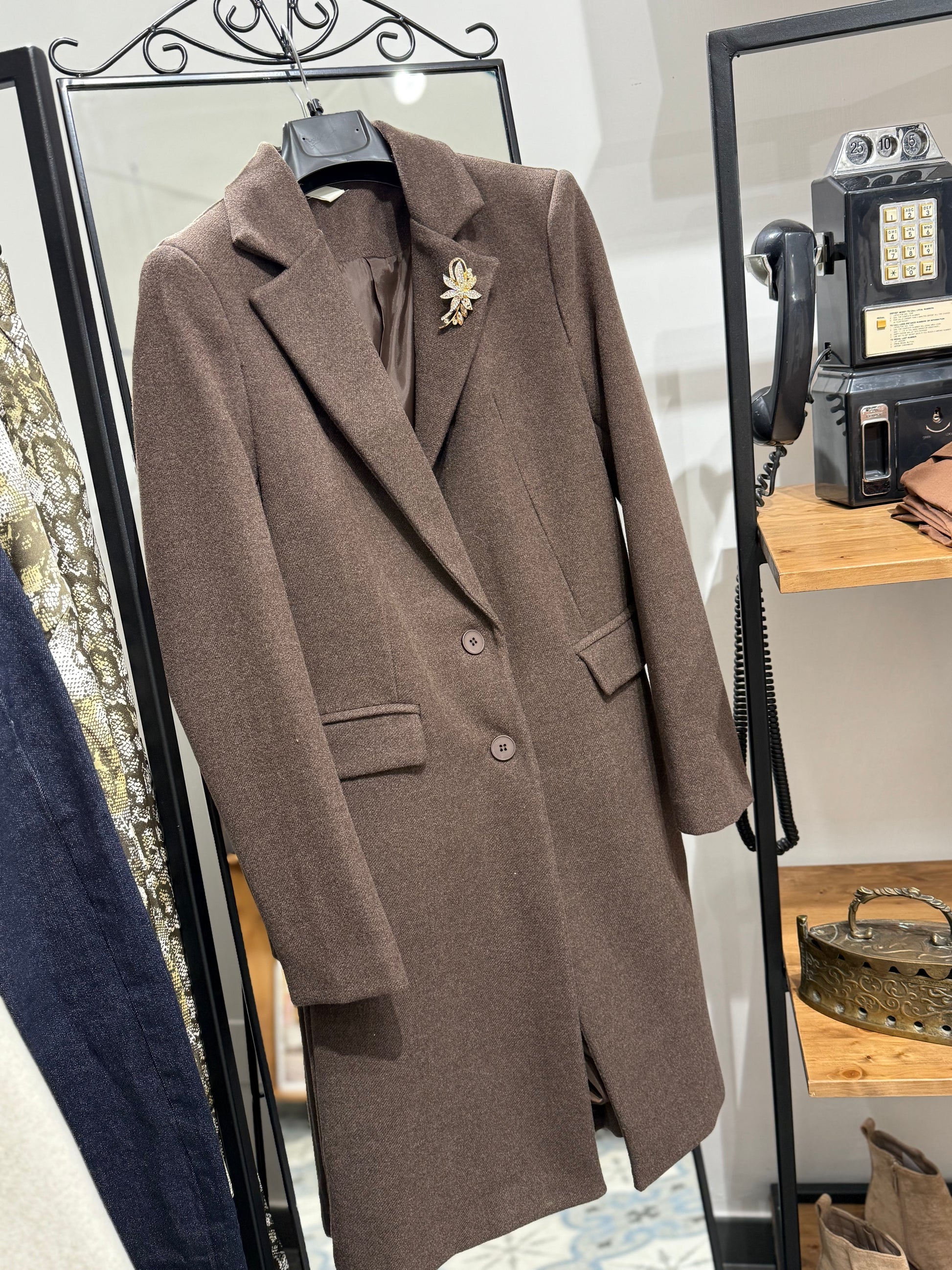 Cappotto in tinta unita marrone. Chiusura a bottoni monopetto. Collo rever semplice. Interno foderato in in fodera marrone. Manica lunga. Un capo semplice e allo stesso tempo ricco di personalità. Lunghezza media. Vestibilità regolare. Peso medio.