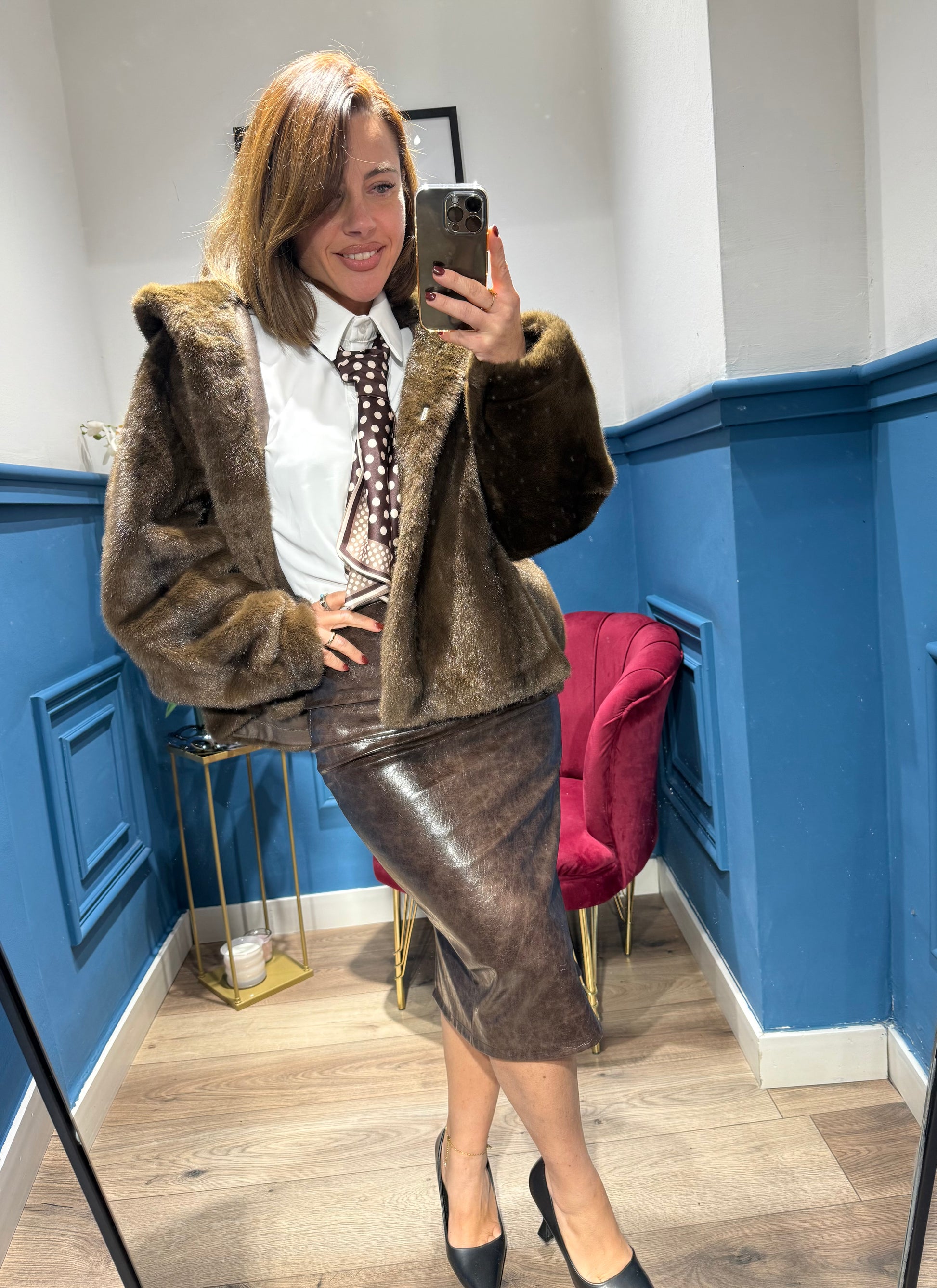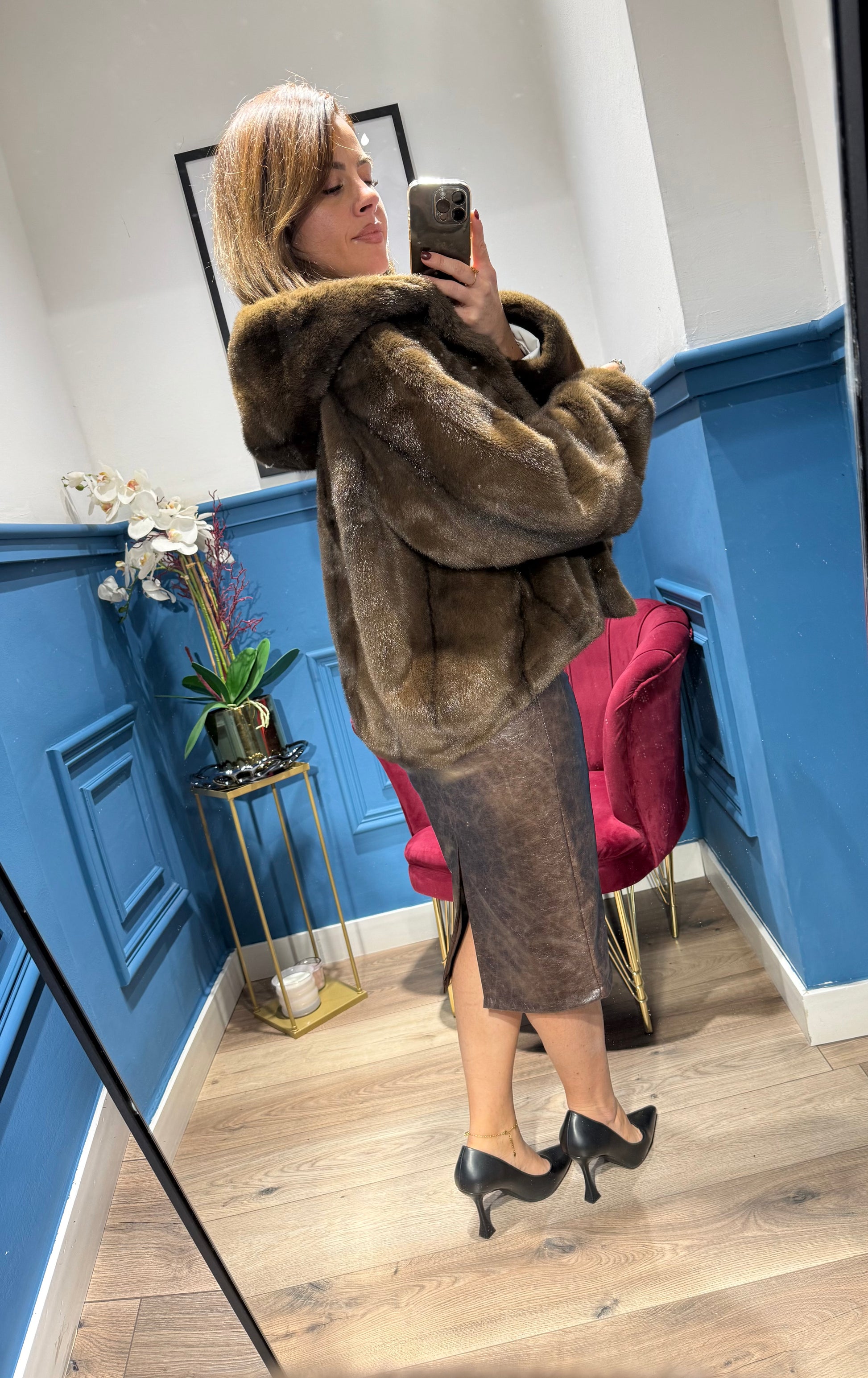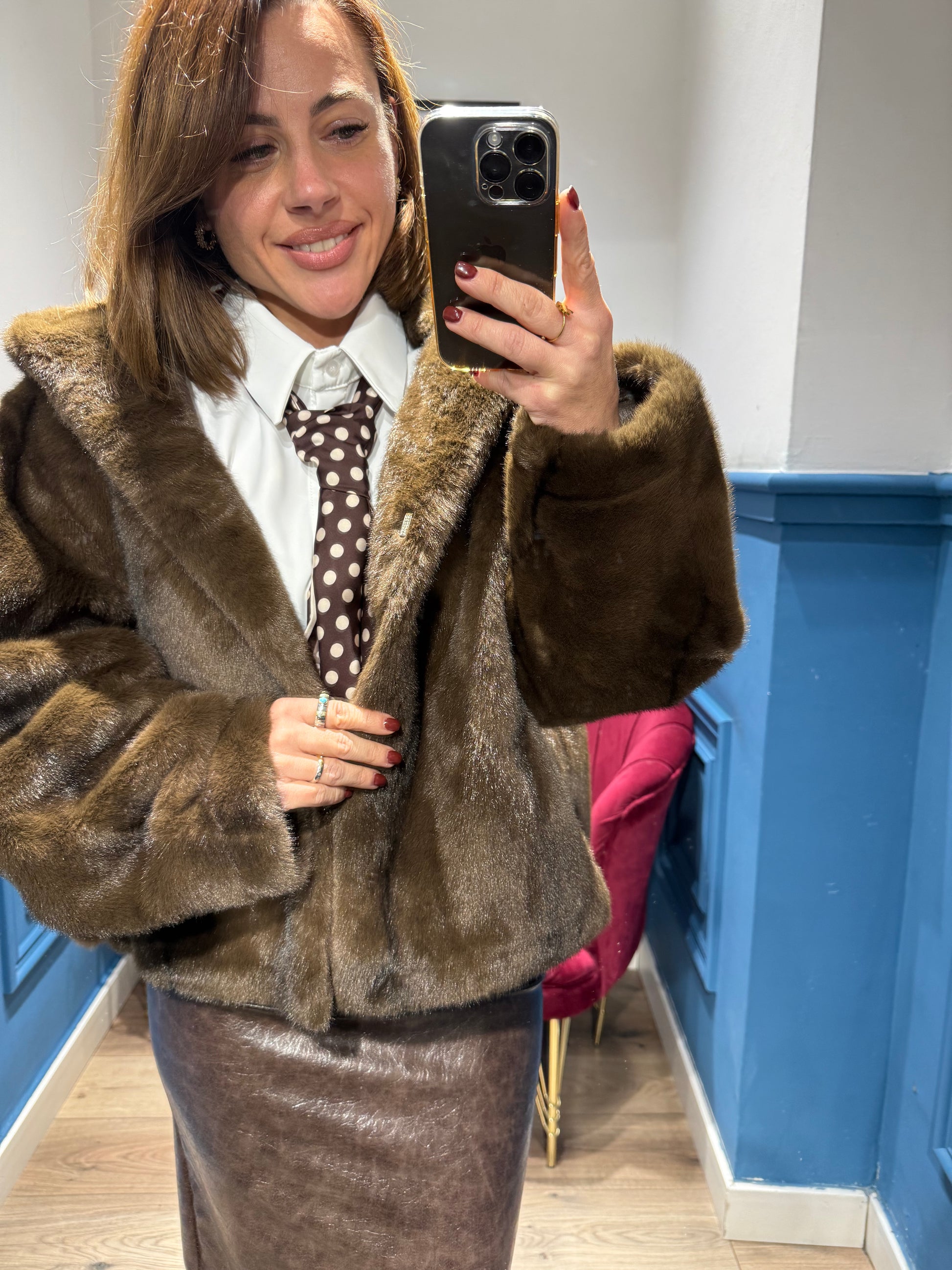 Morbidissima ecopelliccia con cappuccio e bottoncini gioiello disponibile solo in marrone,tg unica.