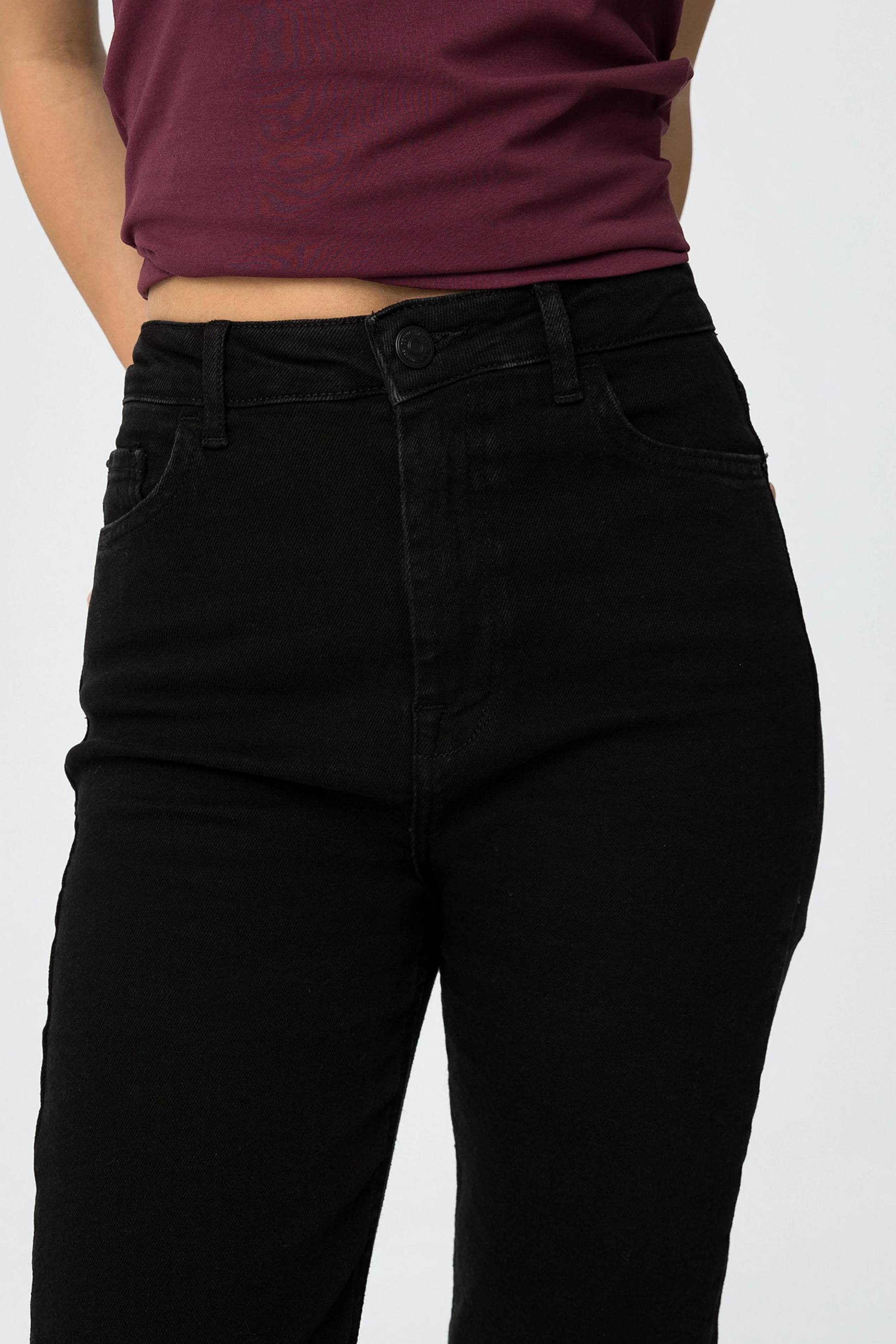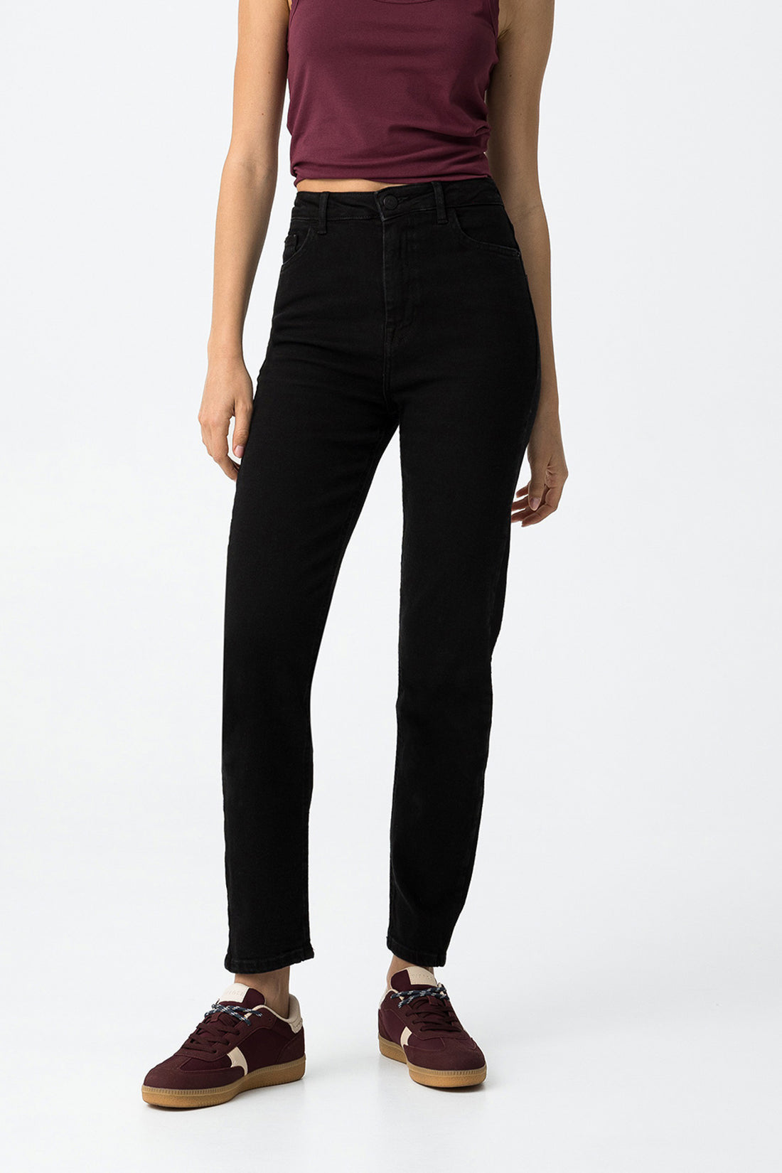 High-waisted five-pocket jeans. Front zip and metal button closure. Available in blue, gray, and black.