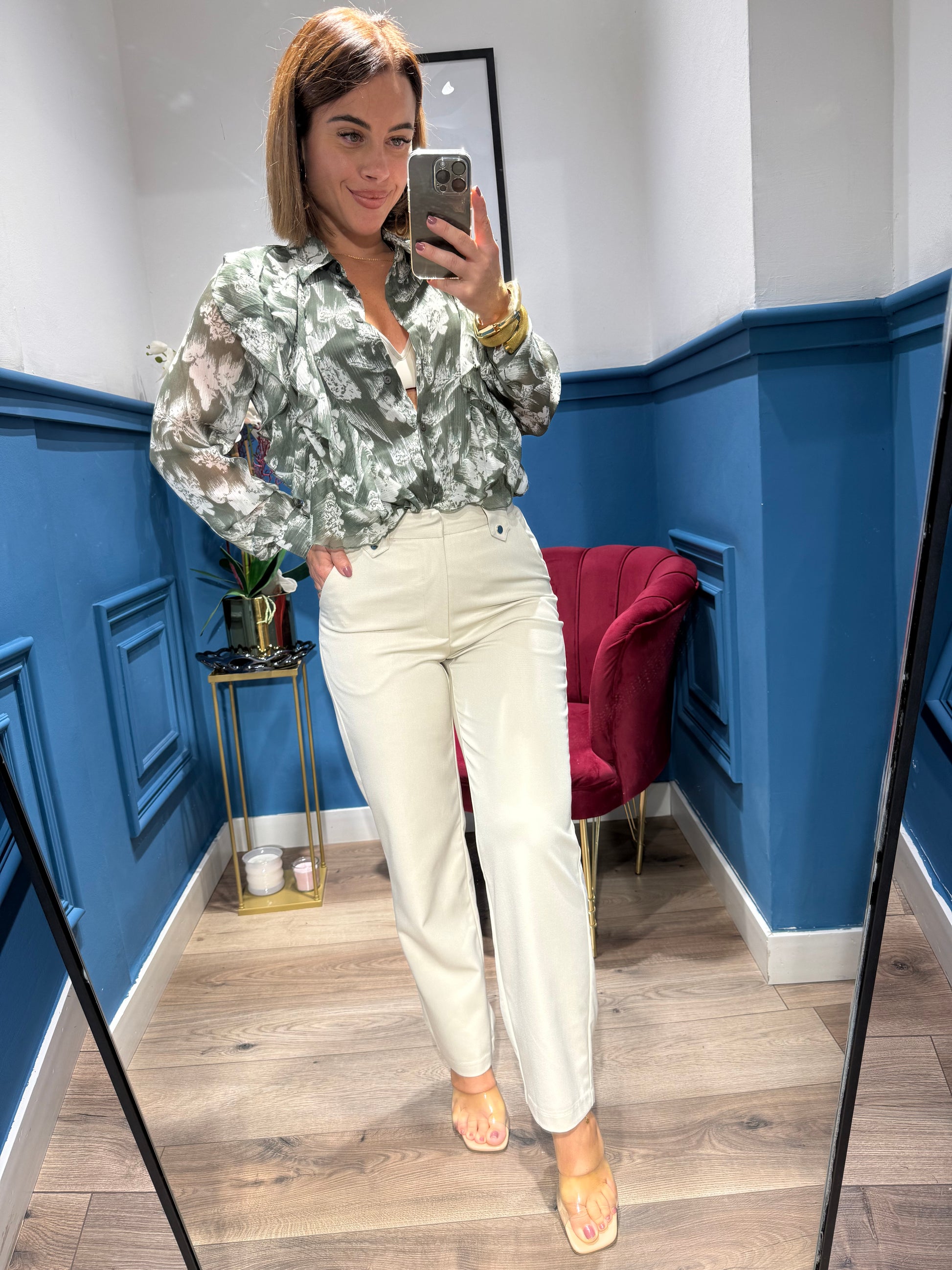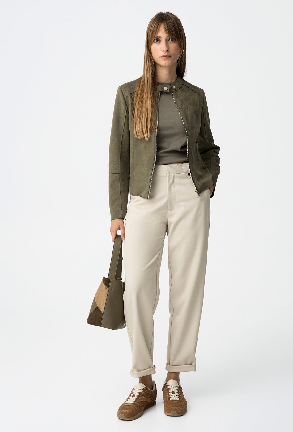 Pantaloni a vita alta con elastico sul retro. Chiusura frontale con zip e gancio in metallo. Tasche laterali e tasche finte con linee nitide sul retro. Dettaglio di apertura sull'orlo.