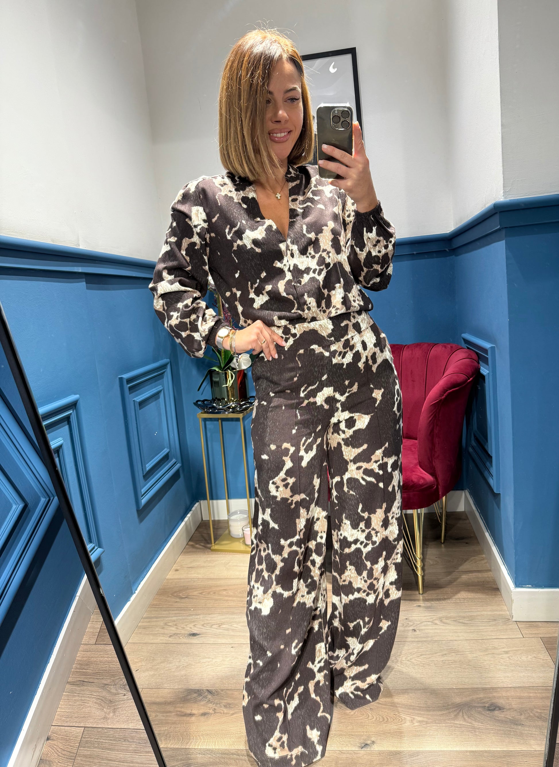 Pantaloni Palazzo con stampa animalier all-over, due tasche frontali e chiusura laterale con zip.