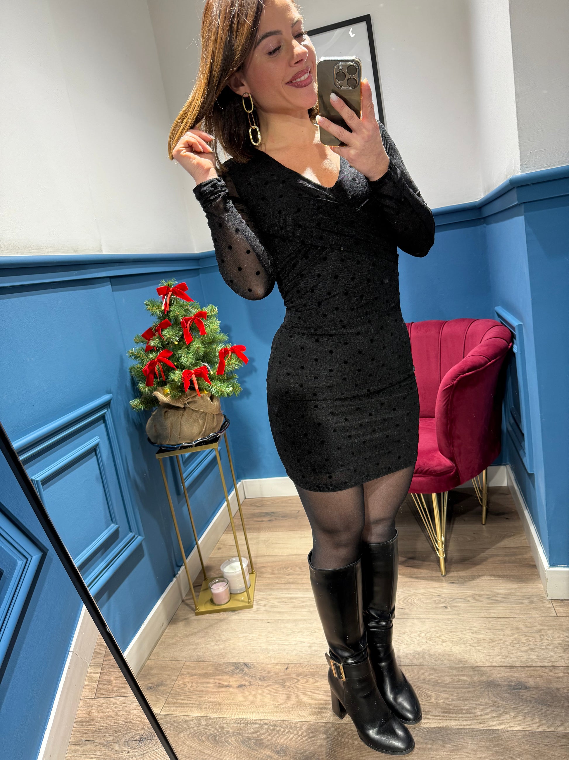 mini dress nero aderente, realizzato con un tessuto leggero e trasparente a pois sovrapposto a una base opaca. Ha scollatura a V e maniche lunghe velate, che danno un tocco elegante e femminile. La linea è avvolgente e mette in risalto la silhouette, mentre la lunghezza sopra il ginocchio lo rende perfetto per una serata o un'occasione festiva.