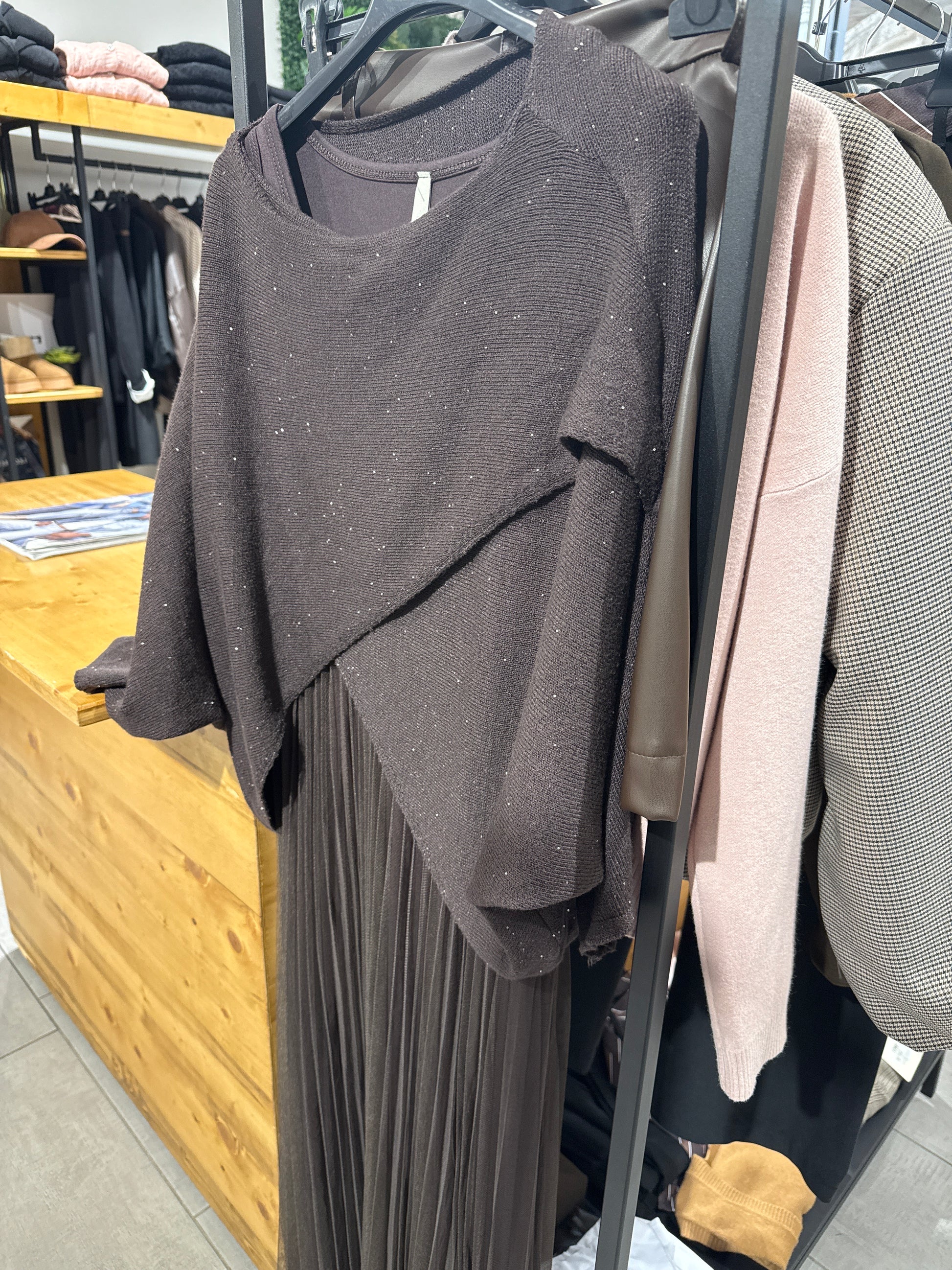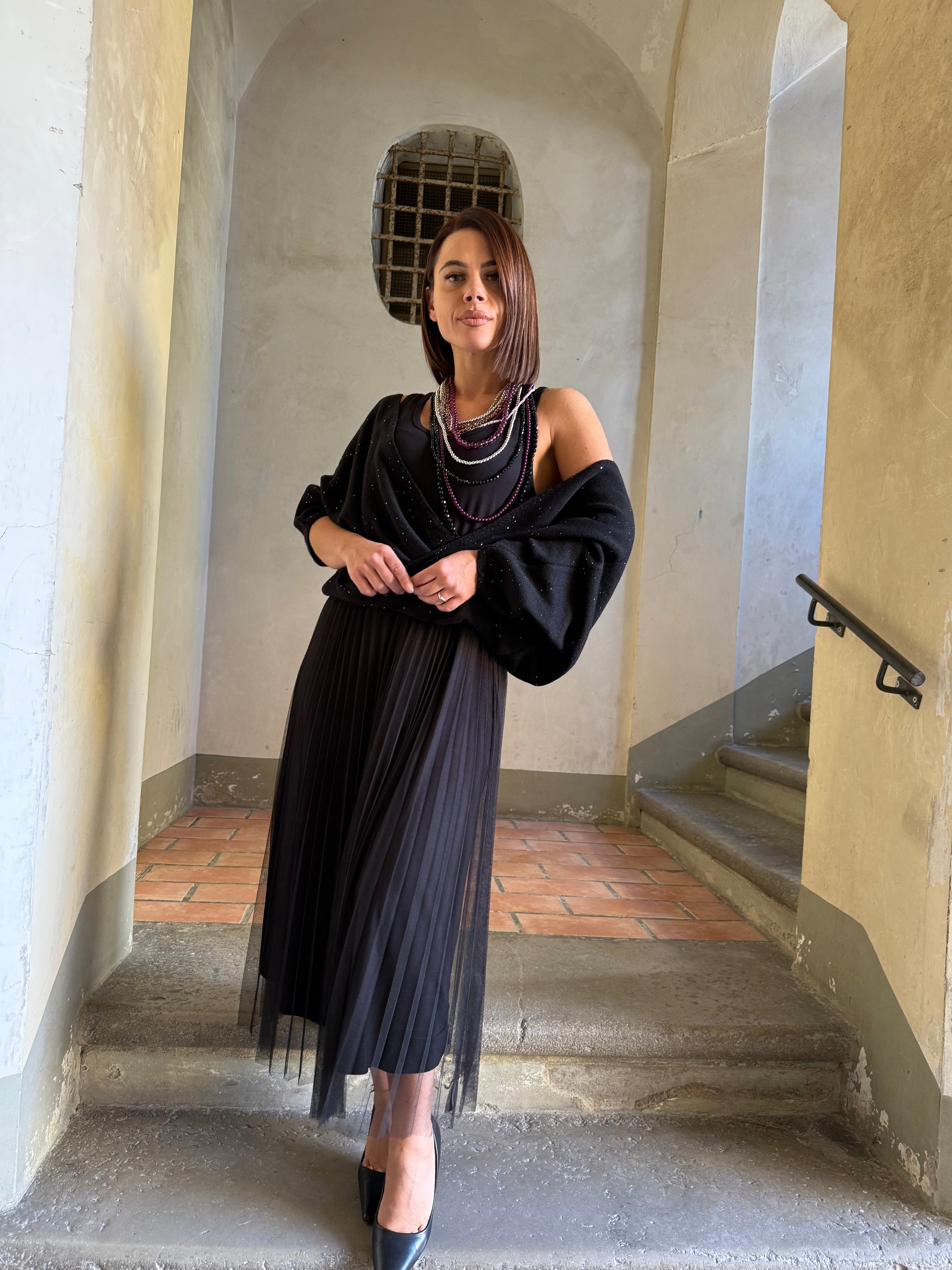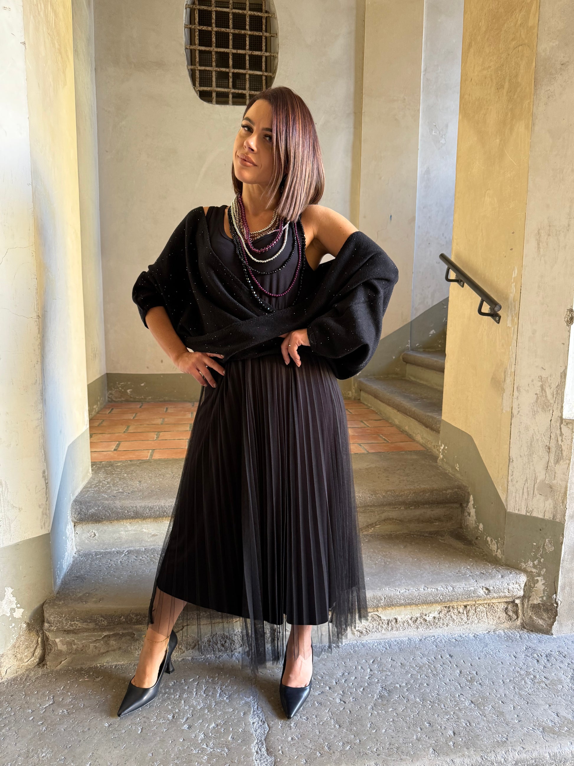 Abito in tulle plissettato con maglione effetto scialle abbinato.Disponibile nero e marrone.