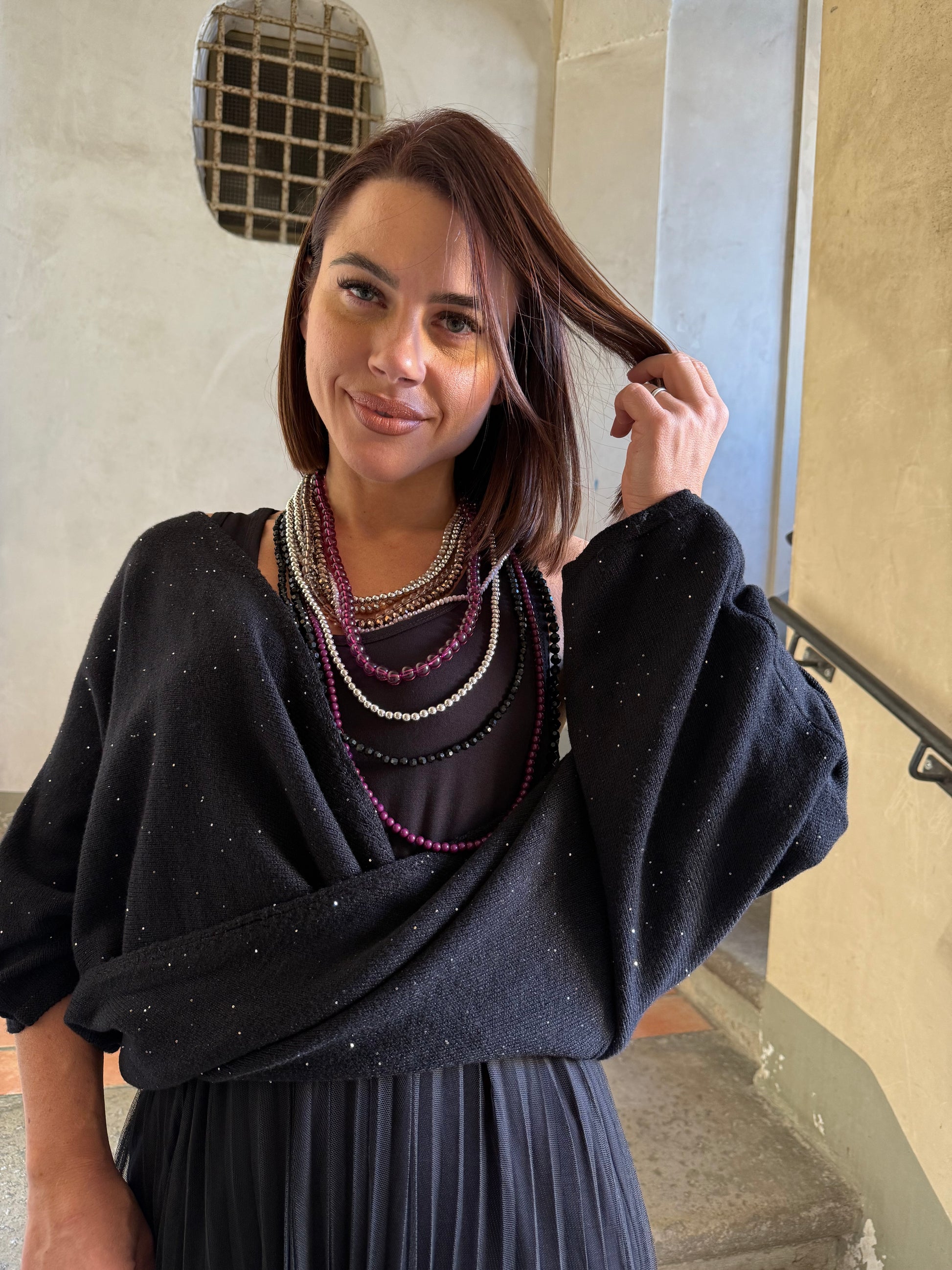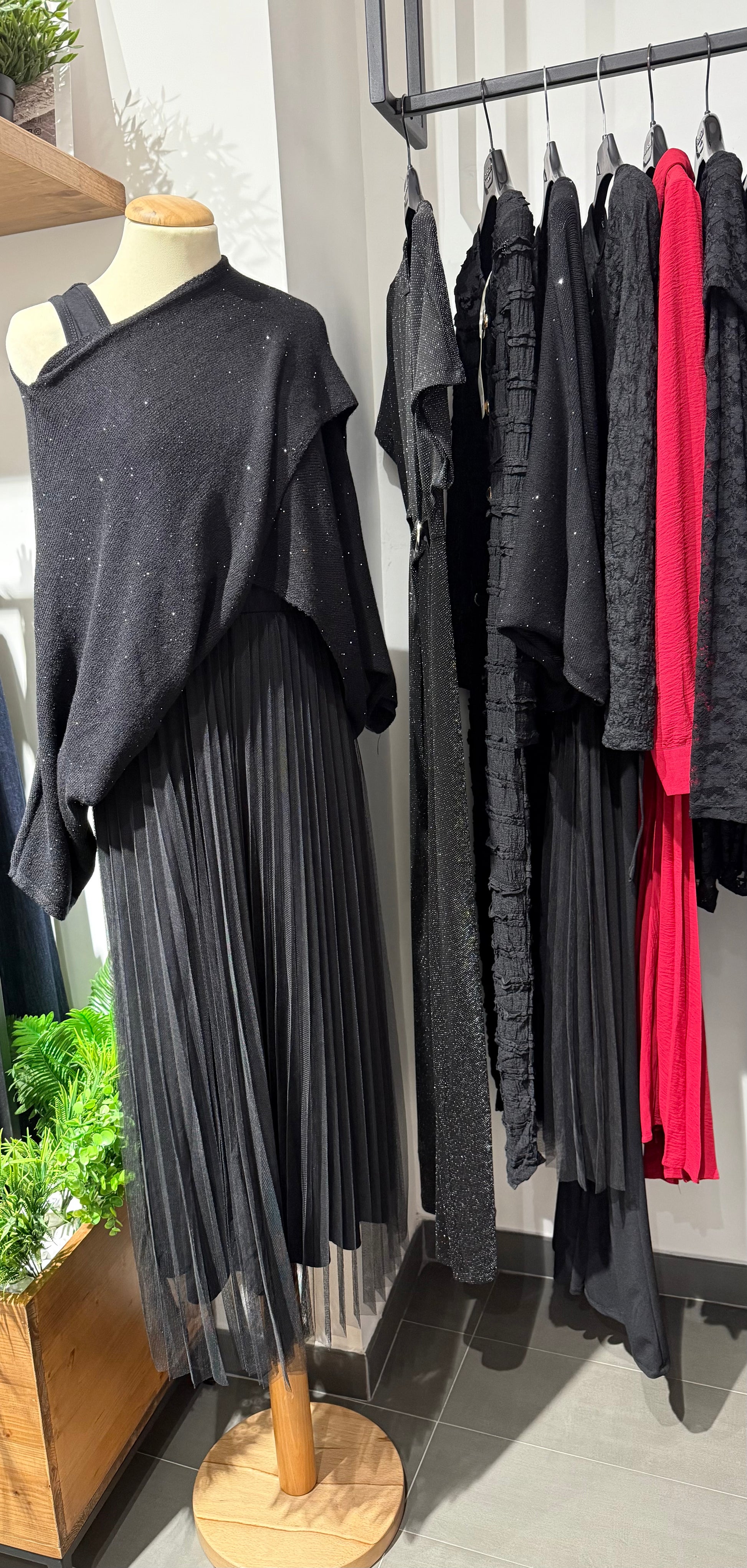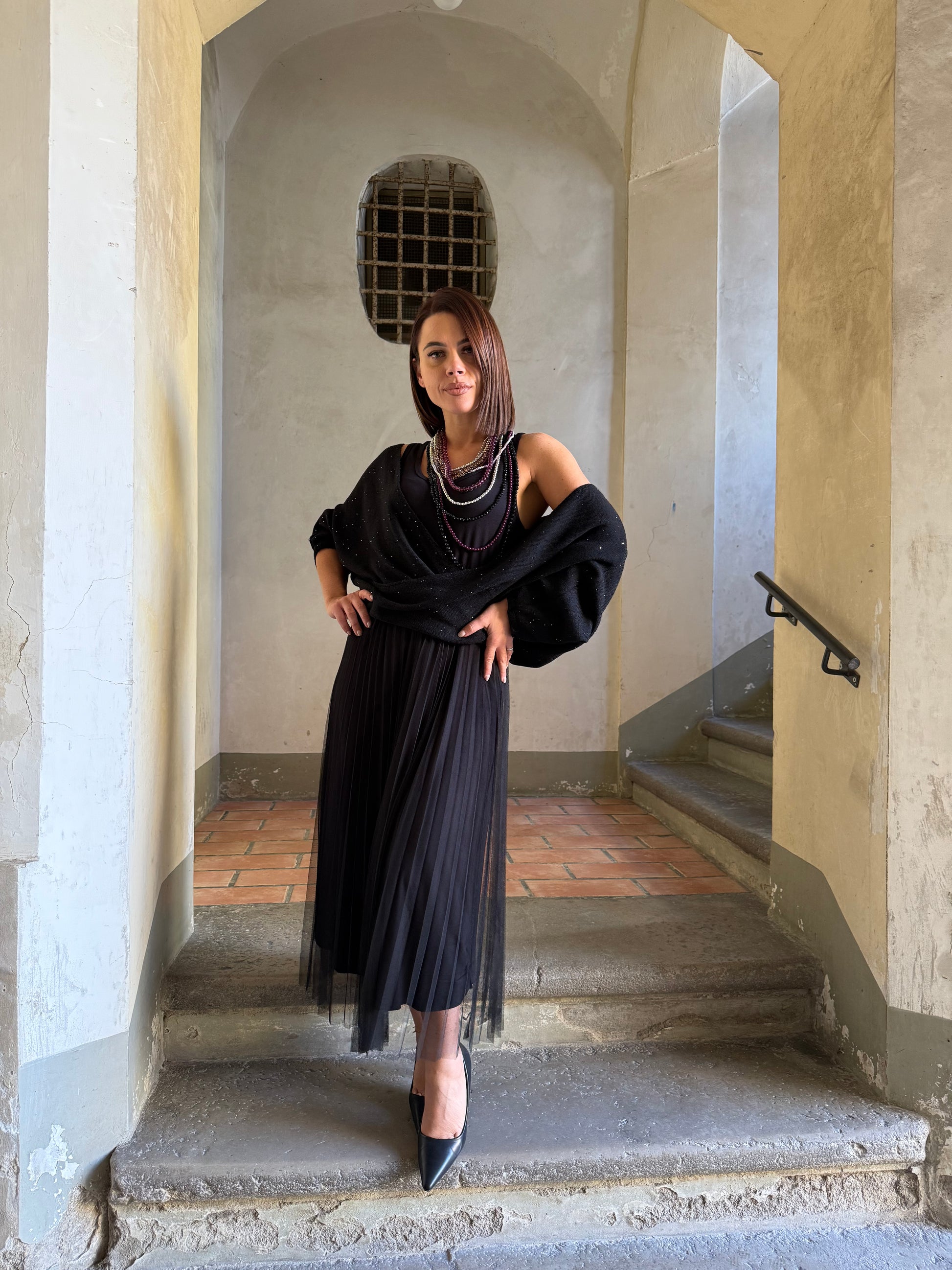 Abito in tulle plissettato con maglione effetto scialle abbinato.Disponibile nero e marrone.