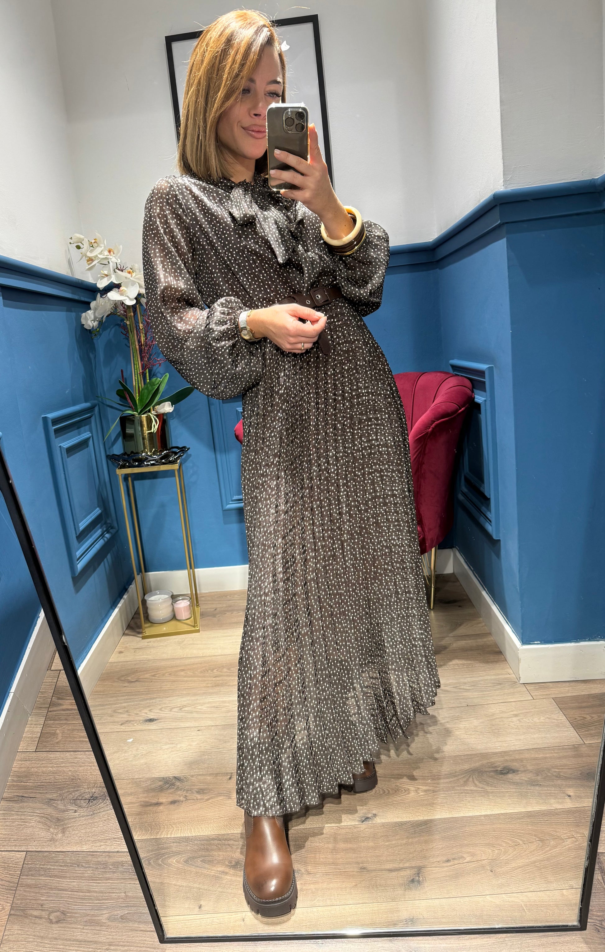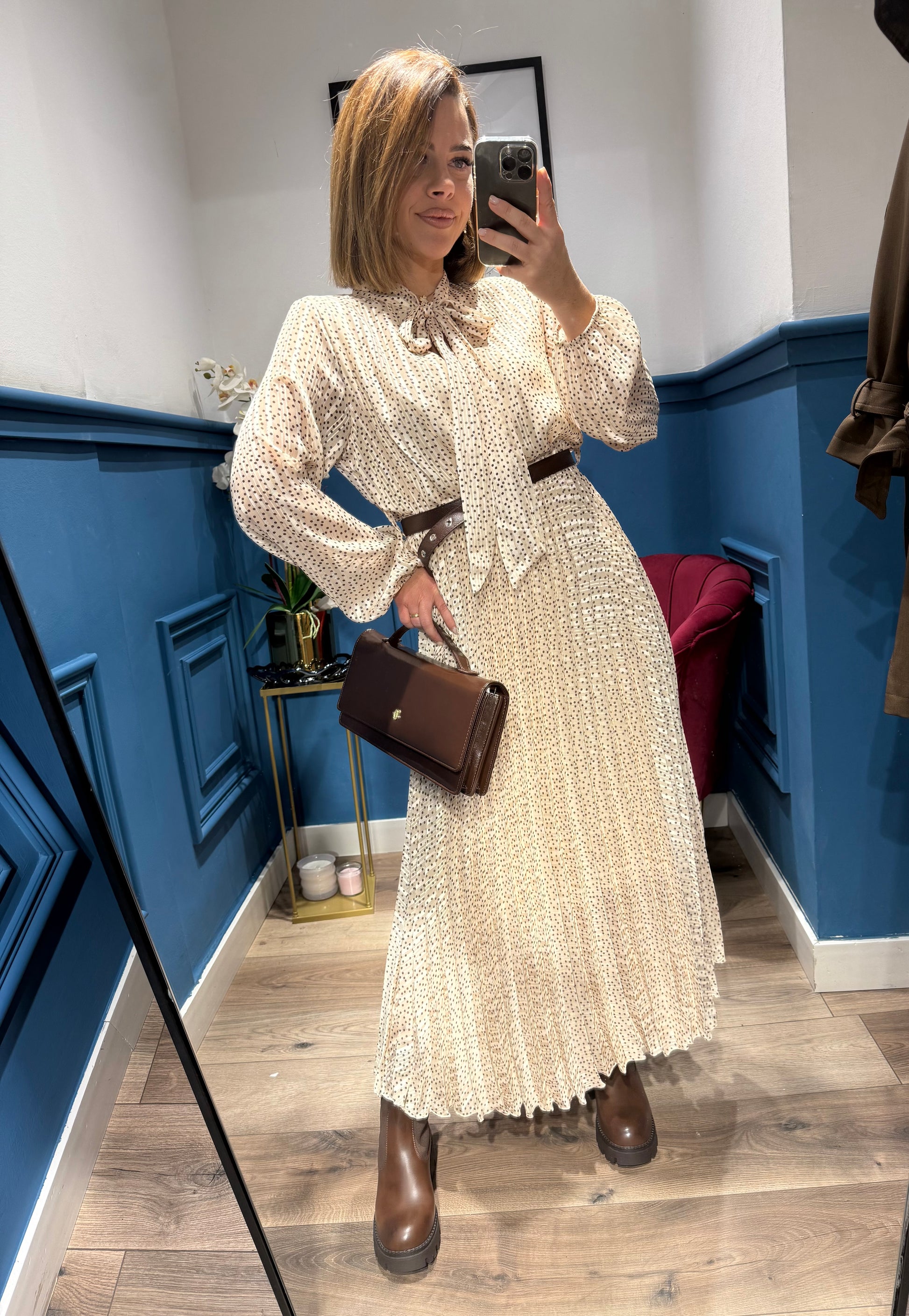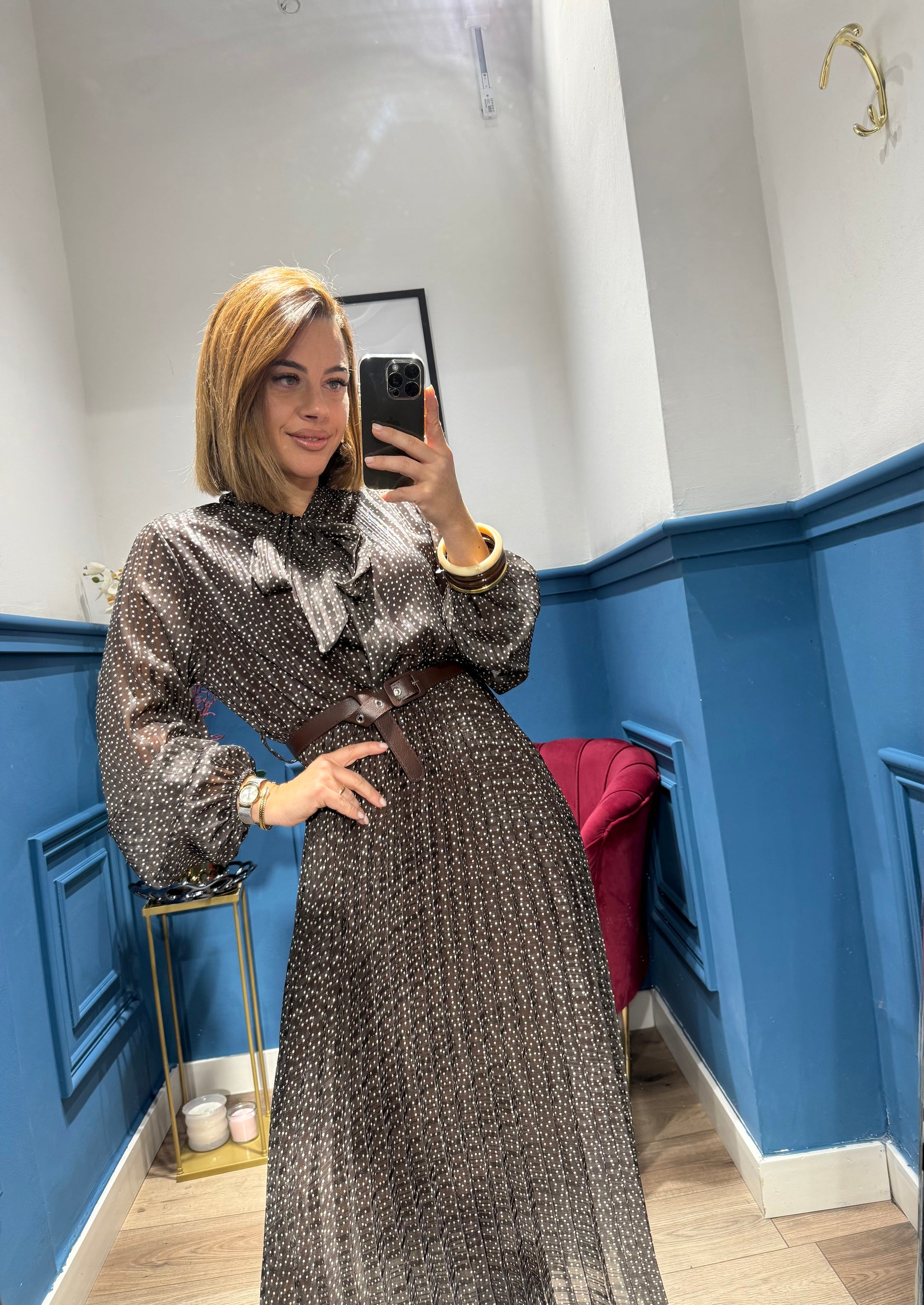 Abito con piccoli pois disponibile fondo crema e fondo marrone. Il cinturino è incluso nell’acquisito dell’abito.