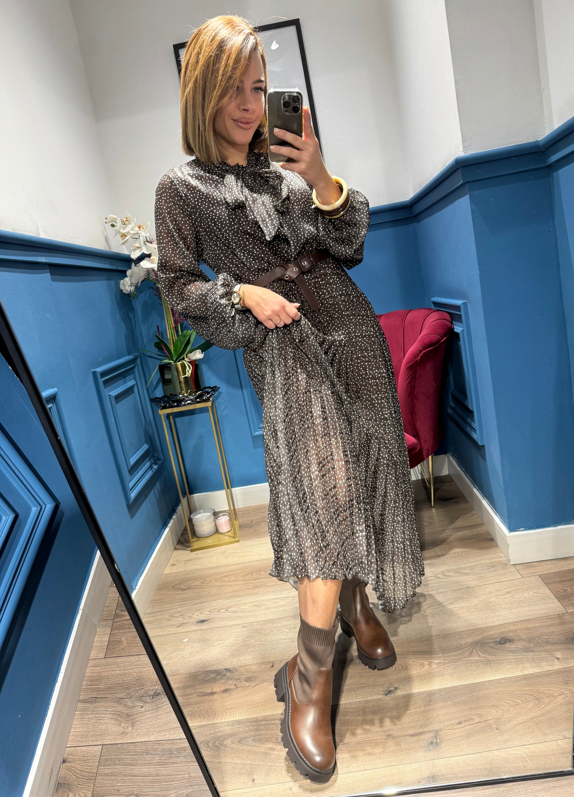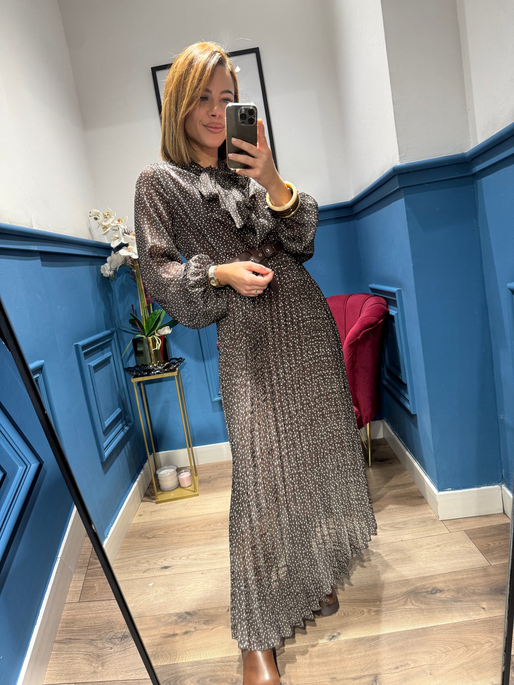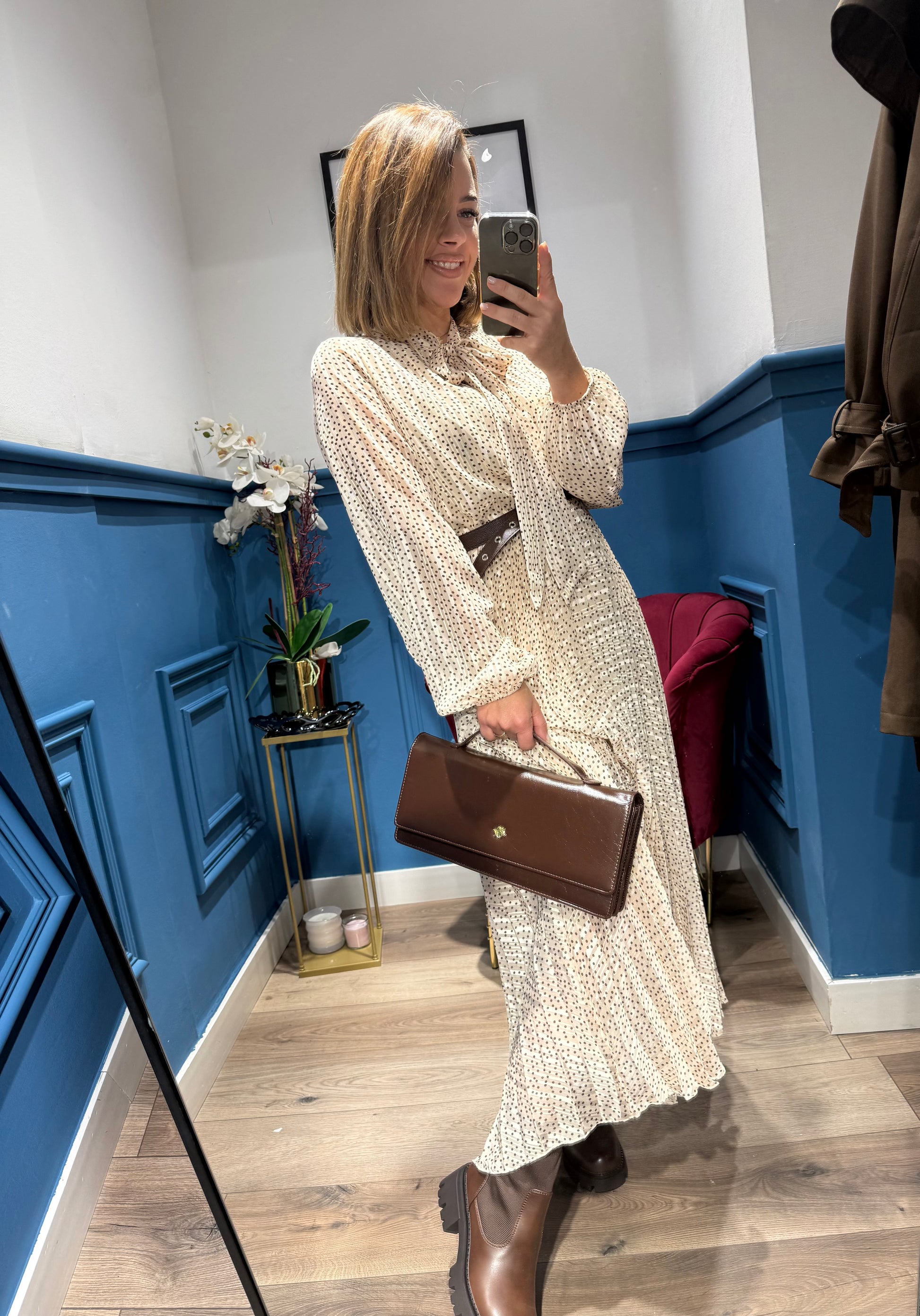 Abito con piccoli pois disponibile fondo crema e fondo marrone. Il cinturino è incluso nell’acquisito dell’abito.