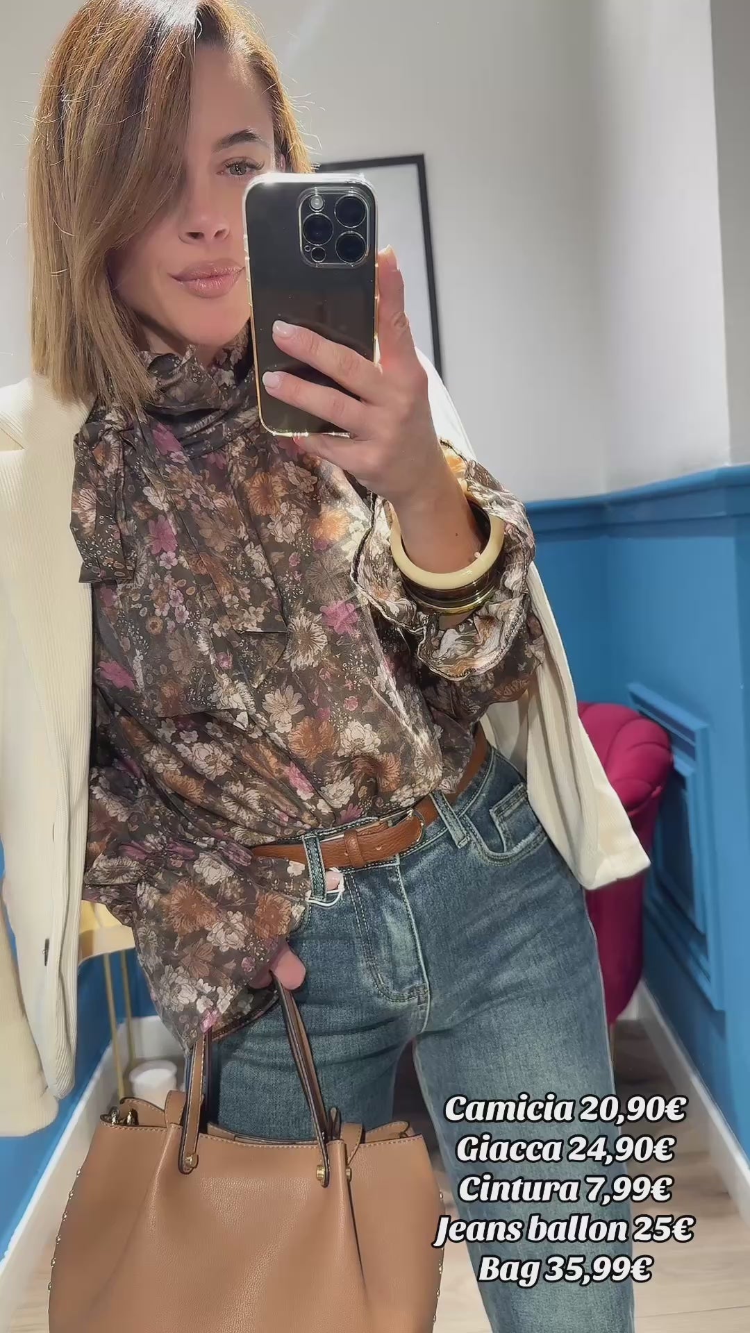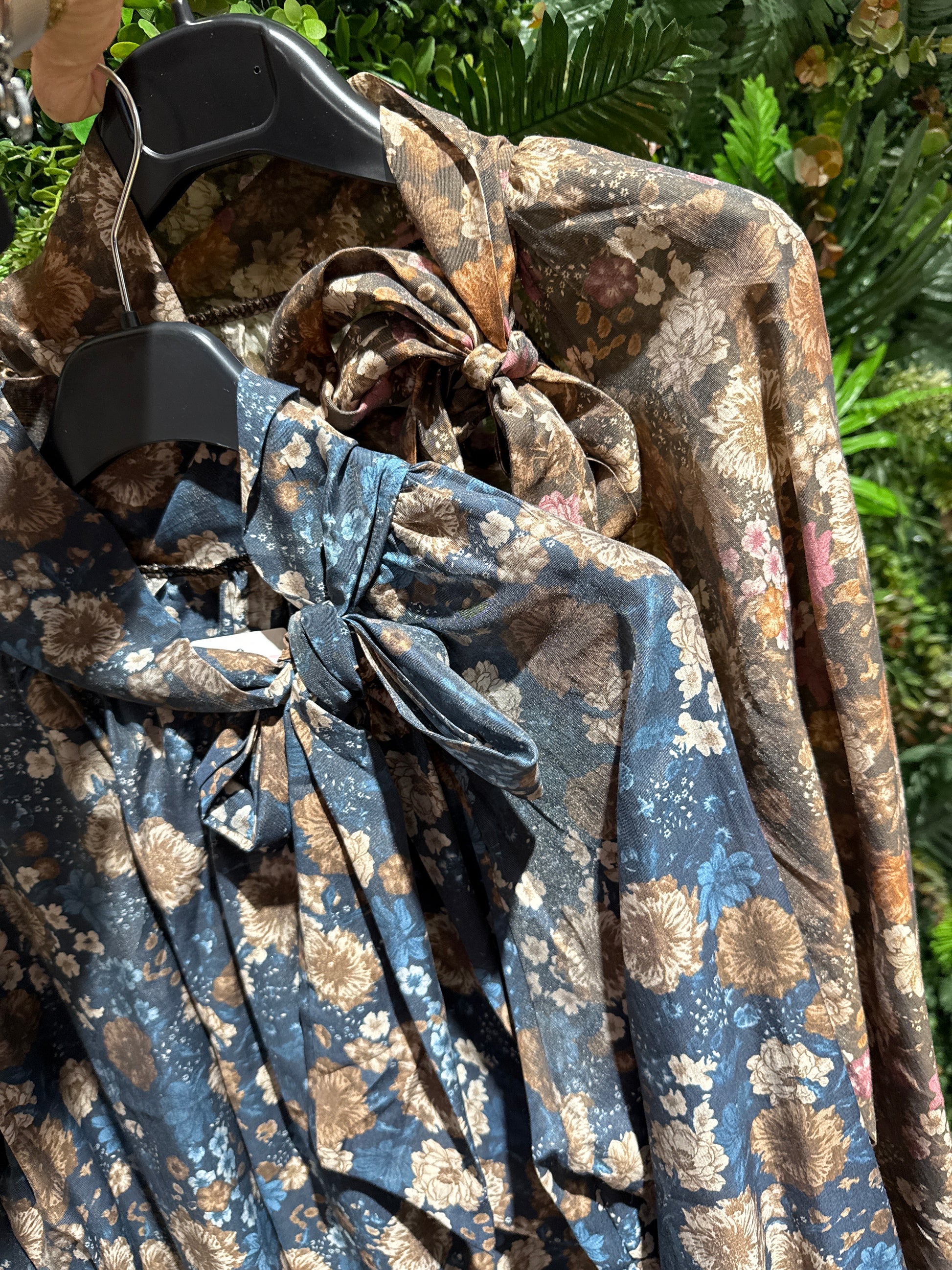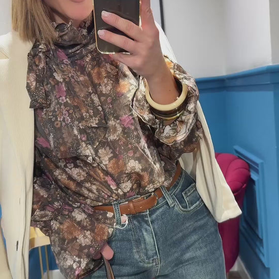 Blusa mezzo collo con fiocco laterale ,fantasia fiori.