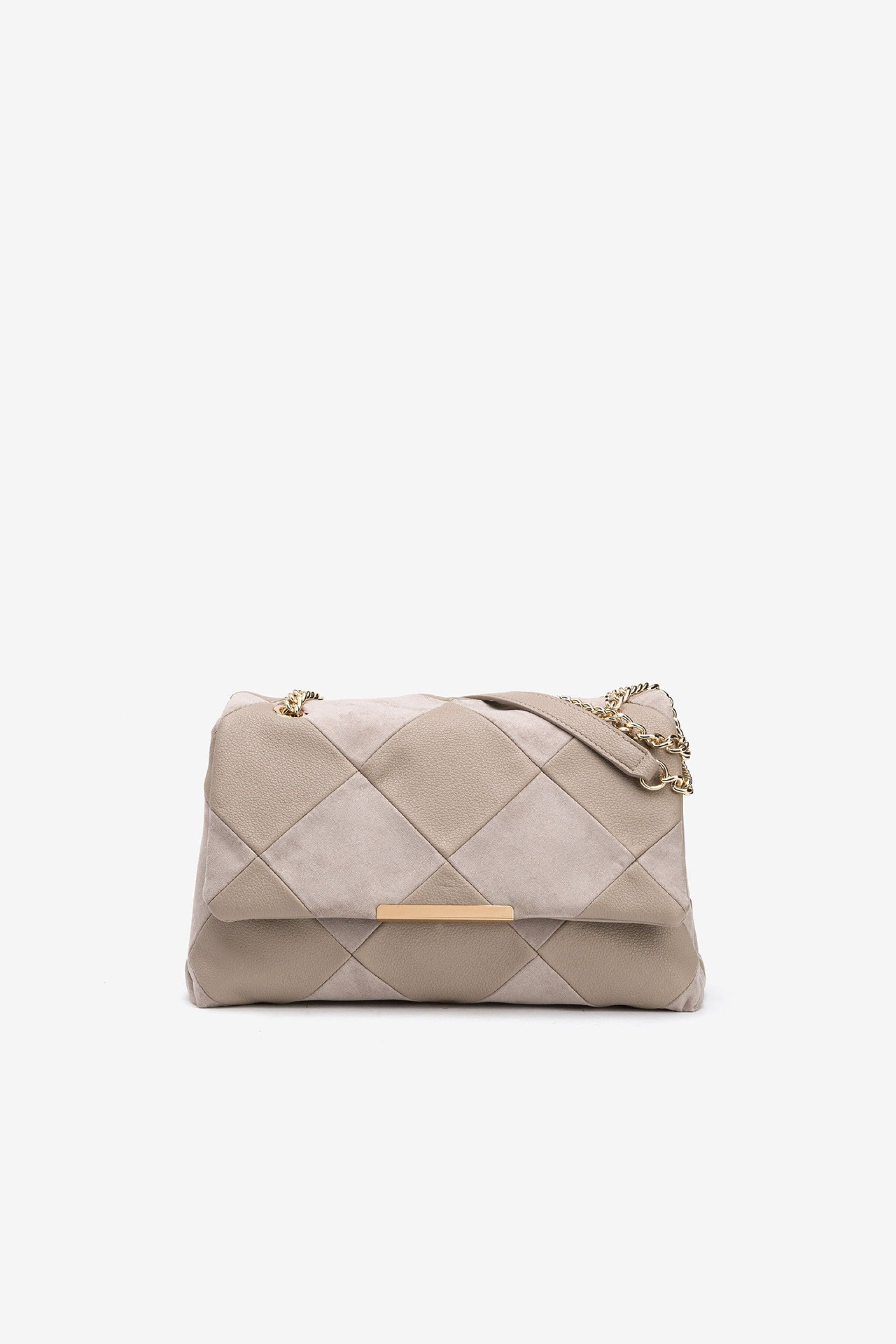 Borsa in ecopelle e camoscio con catena regolabile color oro.