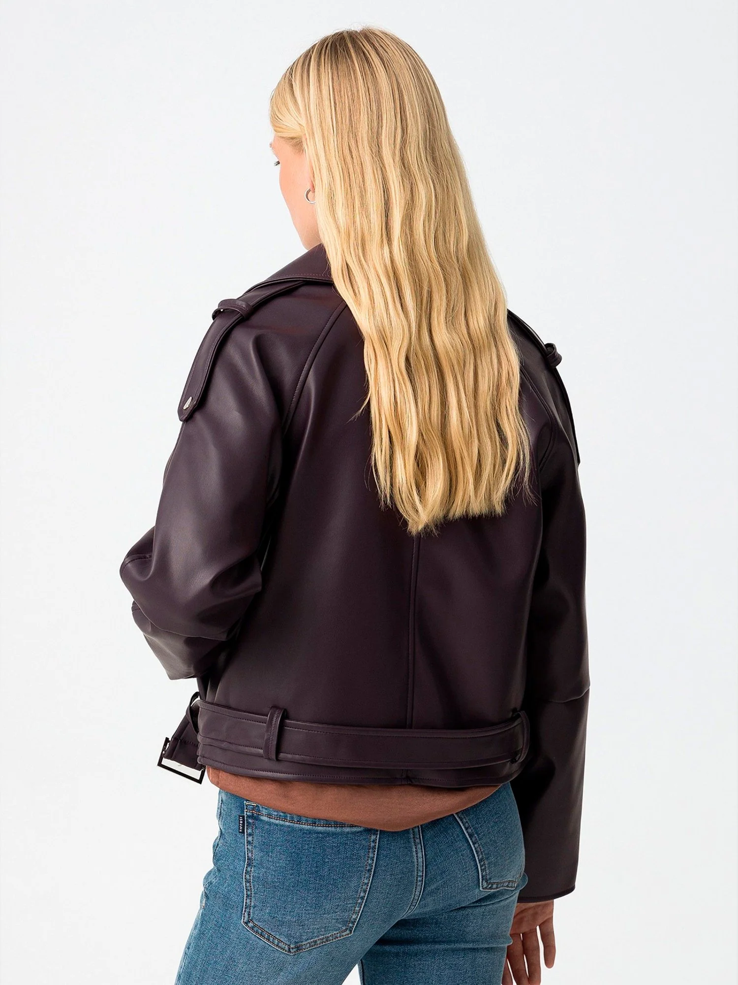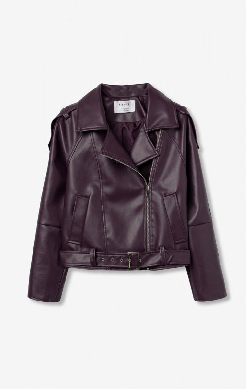 Giacca in ecopelle con due tasche e cintura rimovibile. Chiusura frontale con zip. Disponibile anche in nero.
