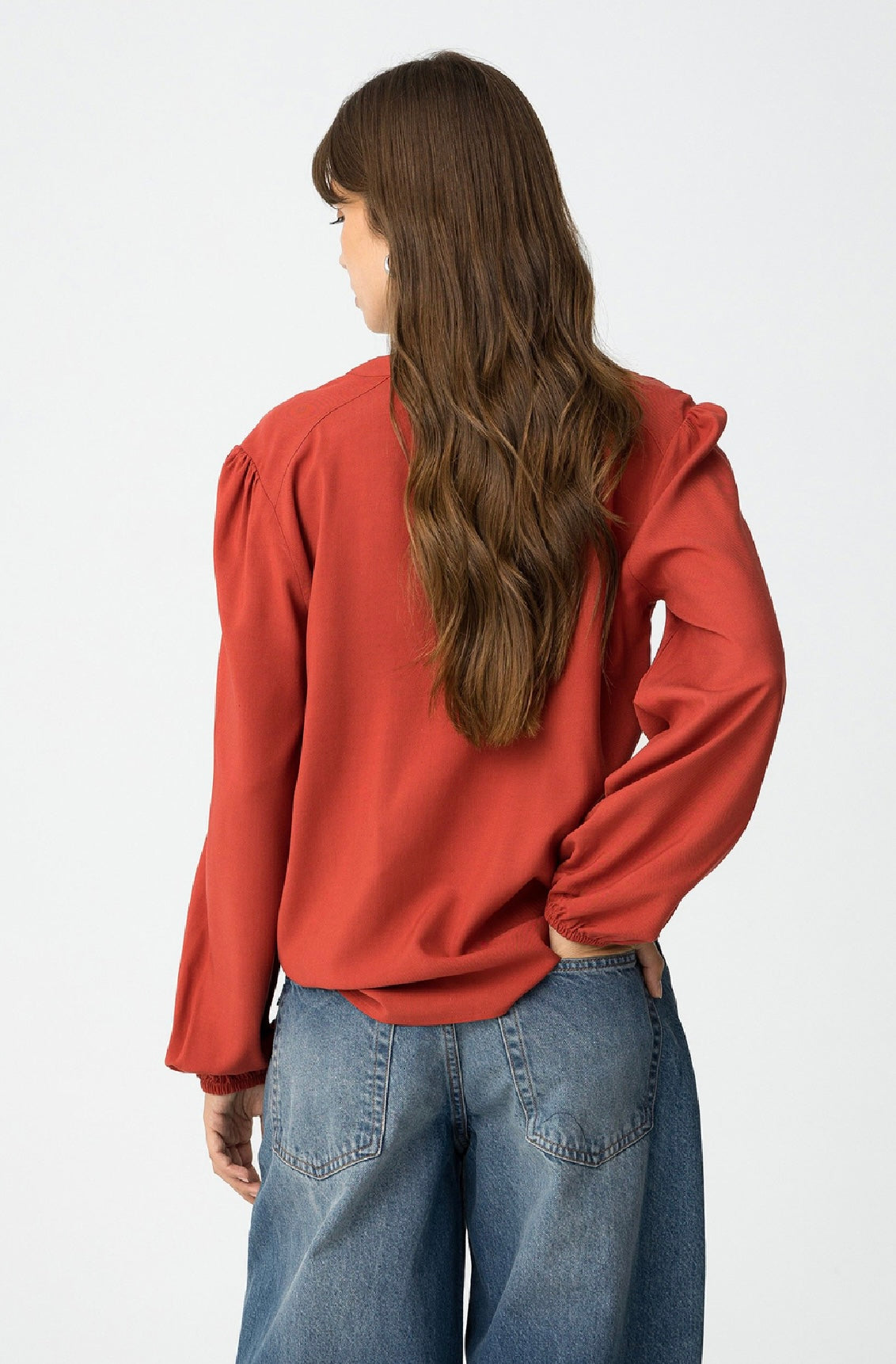 Camicia semplice e vestibilità regolare con chiusura frontale con bottoni. Scollo a V e maniche lunghe con polsini elastici.
