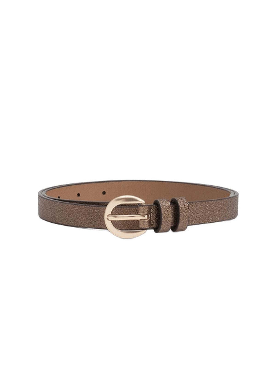 - Cintura marrone: finitura goffrata, fibbia in metallo dorato, due passanti in pelle.