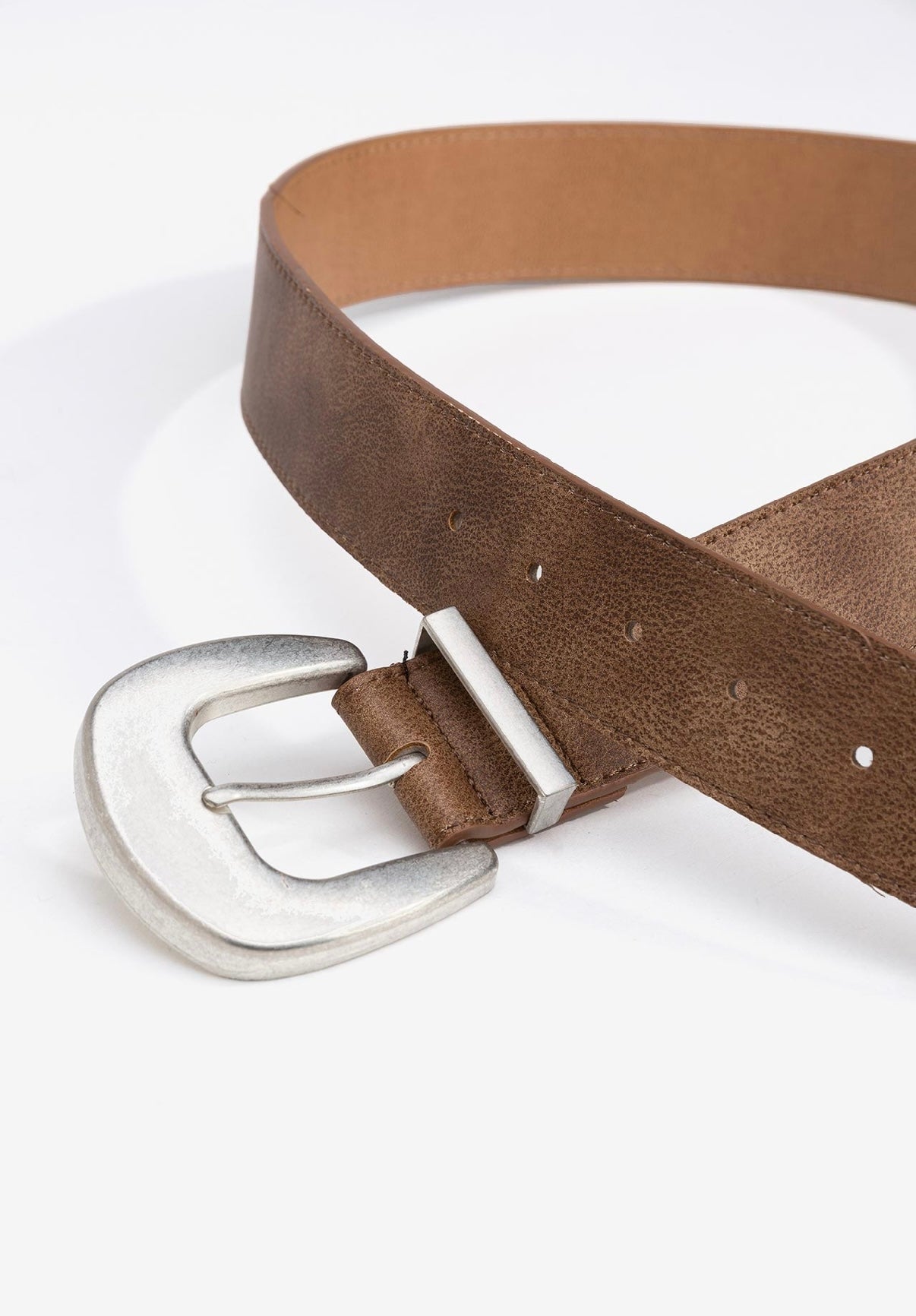 Cintura in ecopelle marrone con fibbia metallica irregolare e regolazione della vita a perno.