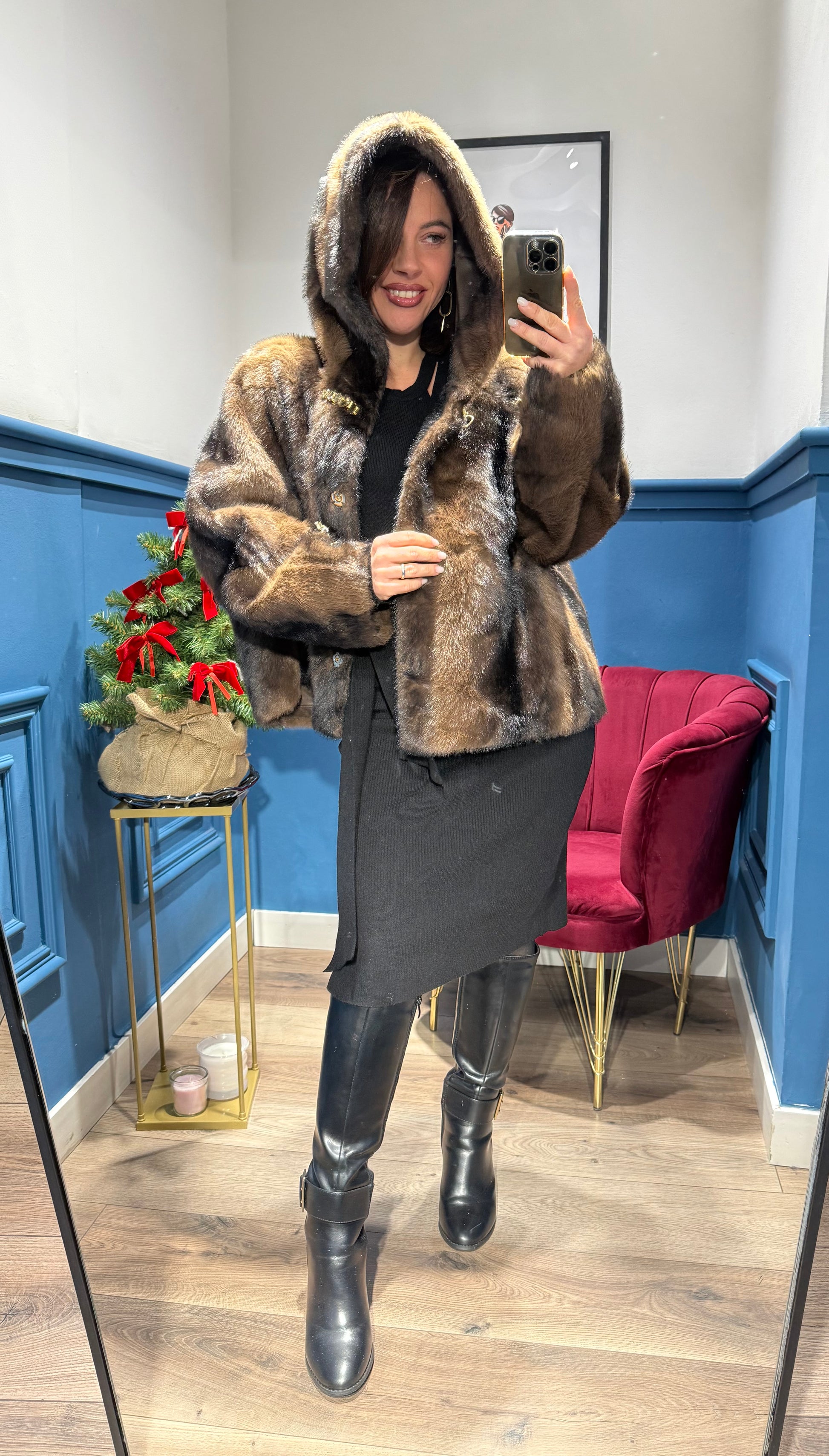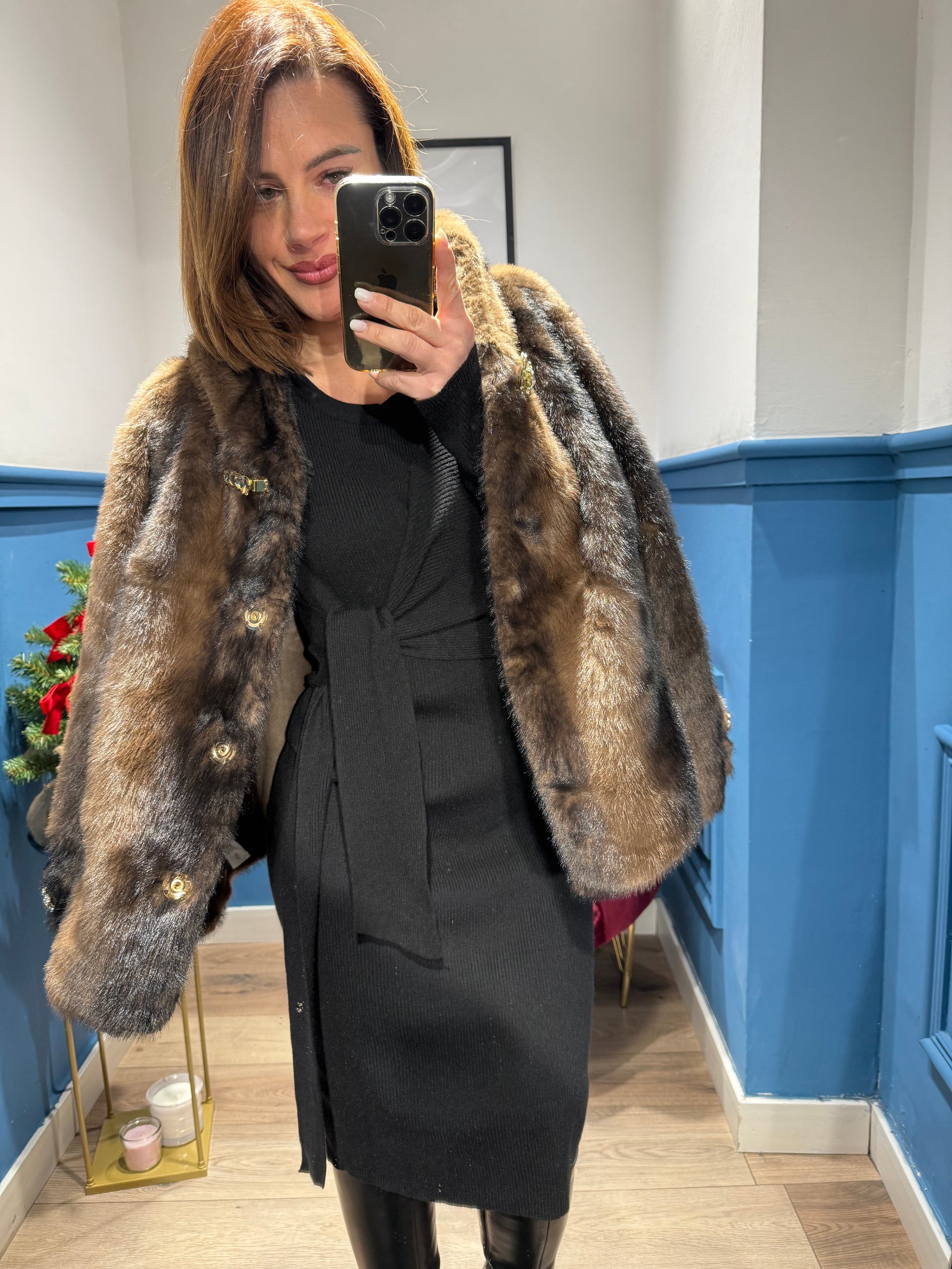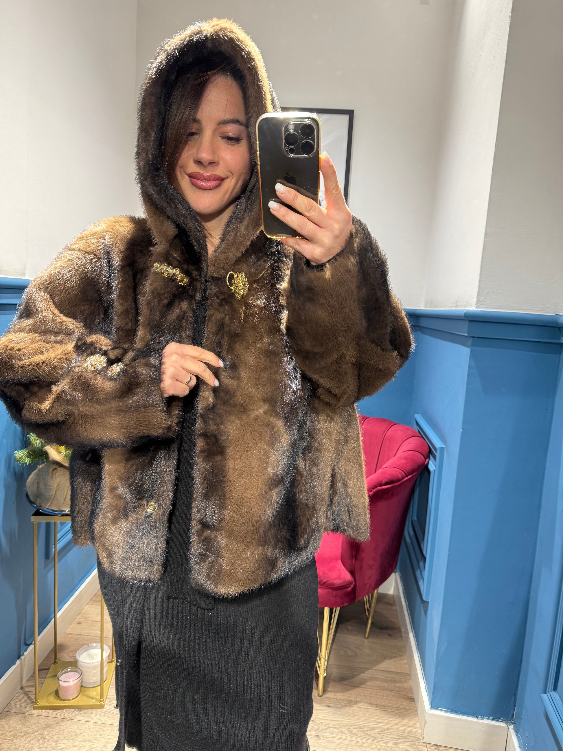 eco-pelliccia con cappuccio, in un marrone caldo con leggere sfumature più scure che le danno profondità e un aspetto molto morbido. Il modello è voluminoso e avvolgente, con una chiusura frontale arricchita da ganci decorativi dorati che aggiungono un tocco elegante. L’effetto complessivo è sofisticato ma moderno, perfetto per look invernali chic.