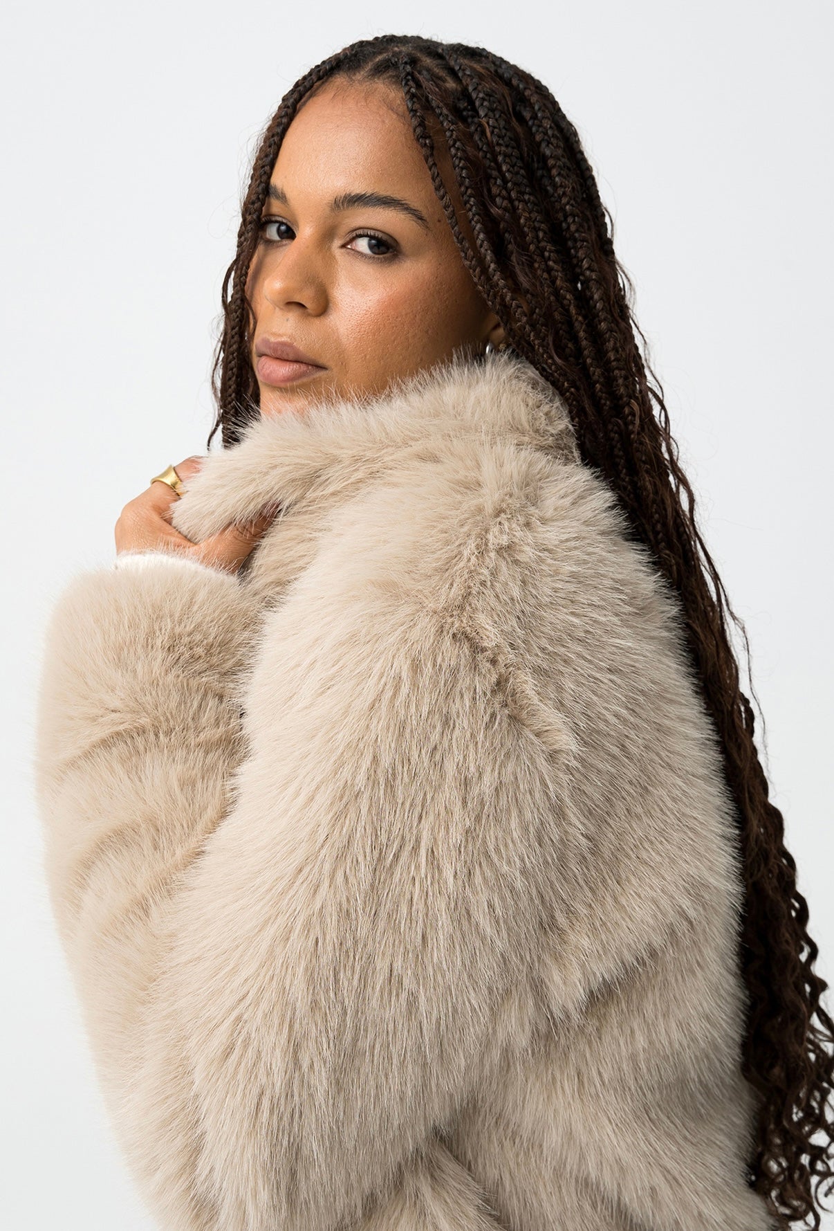 Giacca corta con colletto con risvolto e maniche lunghe. Pelliccia sintetica. Interno foderato. Tasche laterali.