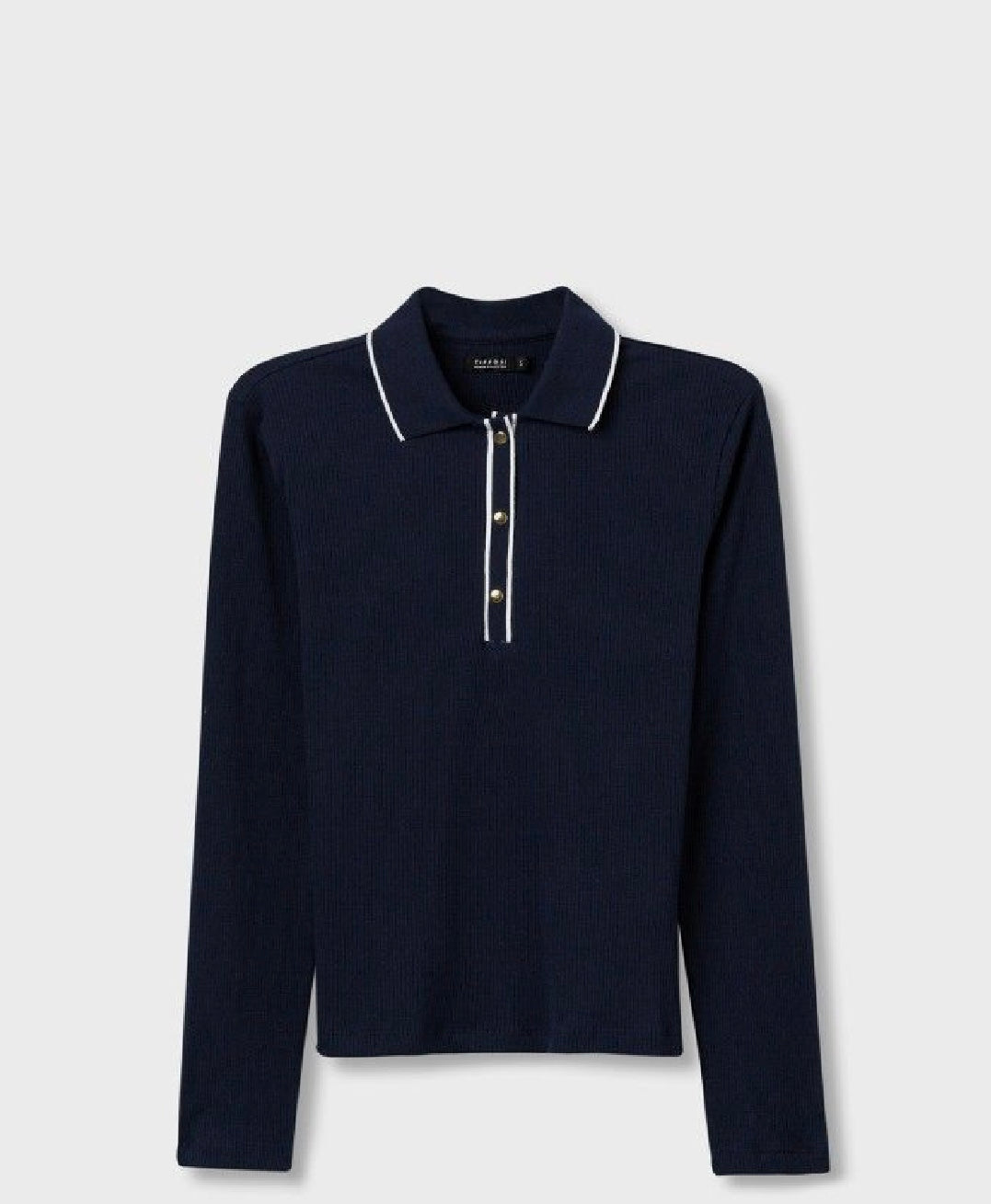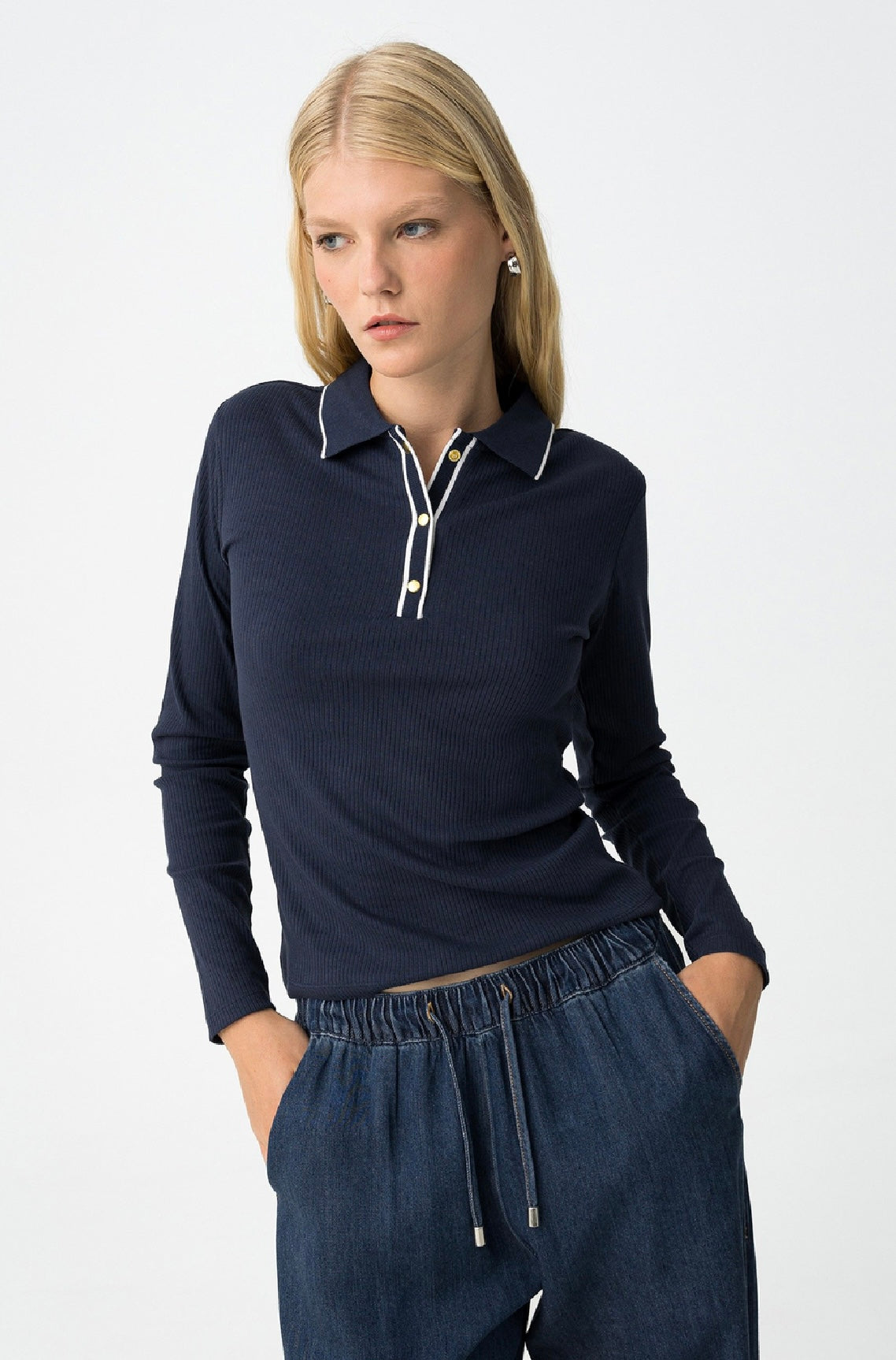 Maglietta avvitata a costine fondo blu con bordini bianchi sul collo e sullo scollo.