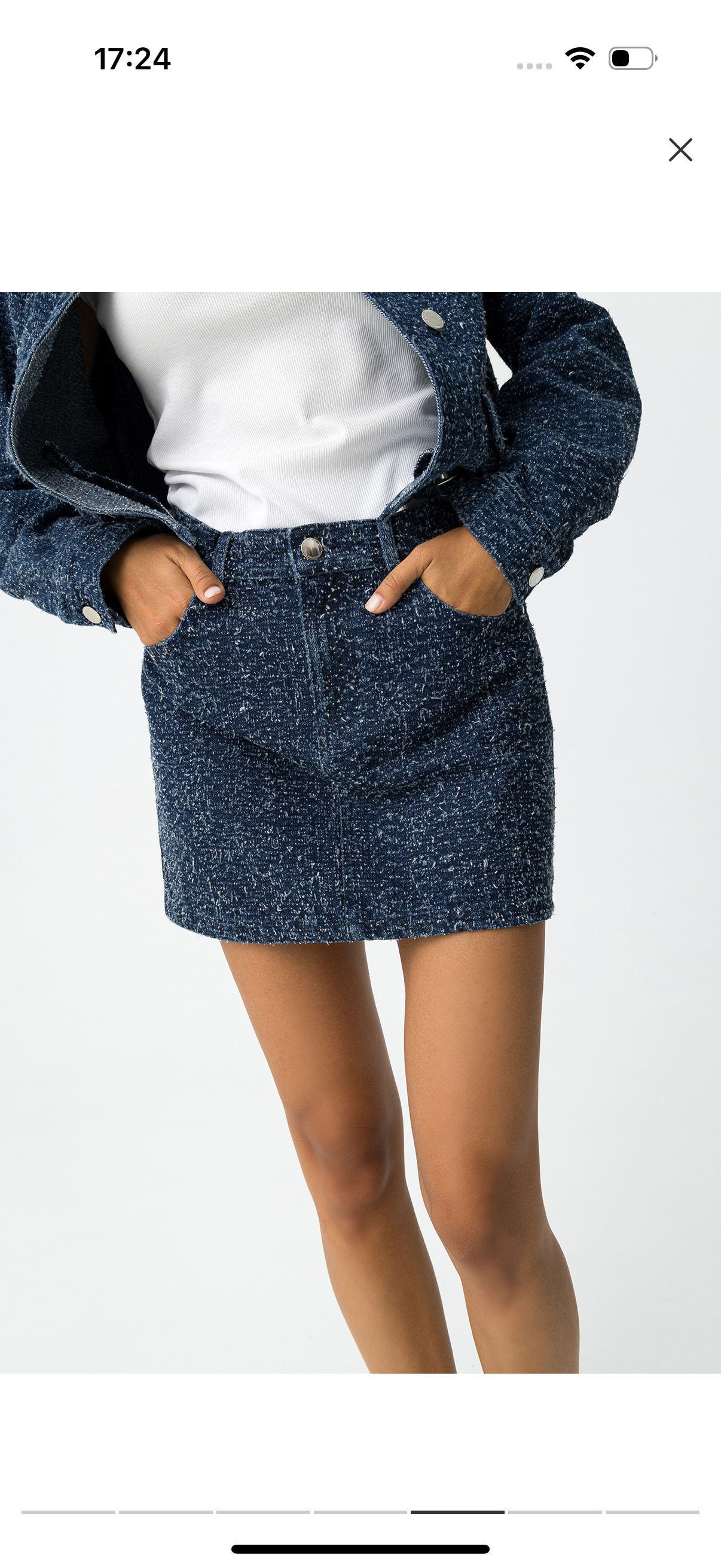 Minigonna in denim sfilacciata a vita alta con cinque tasche, chiusura con zip e bottone in metallo.