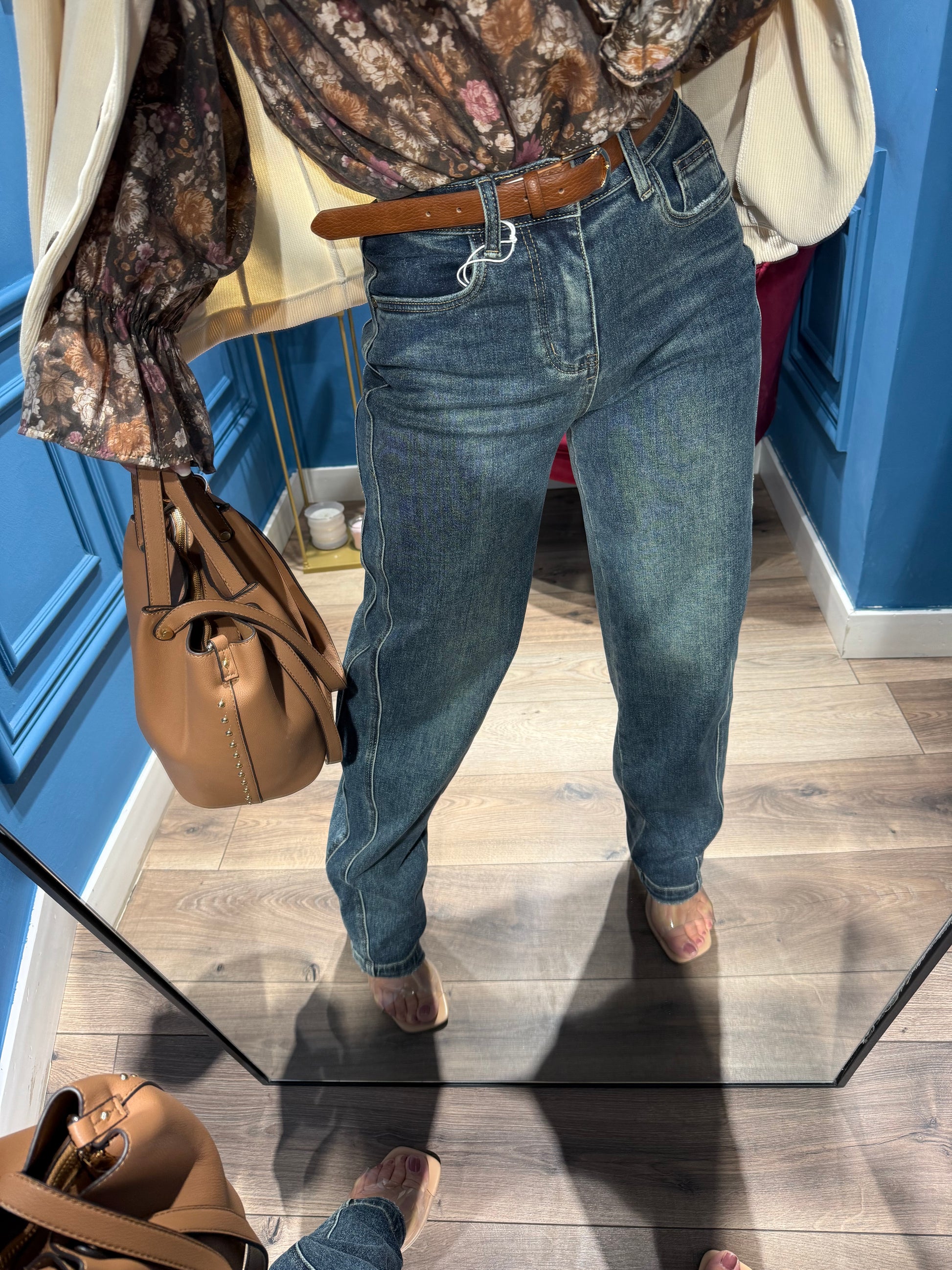 Jeans modello ballon,tessuto stretch,lavaggio blu sabbiato.