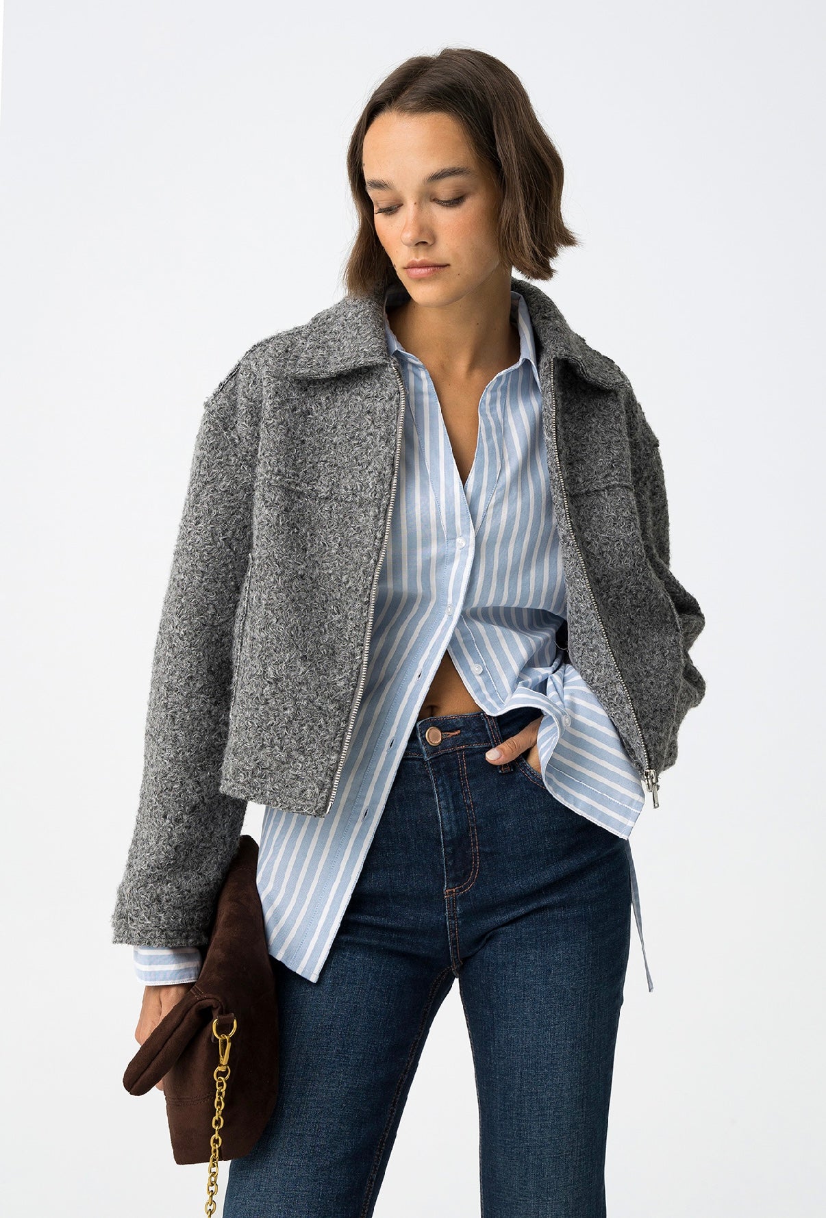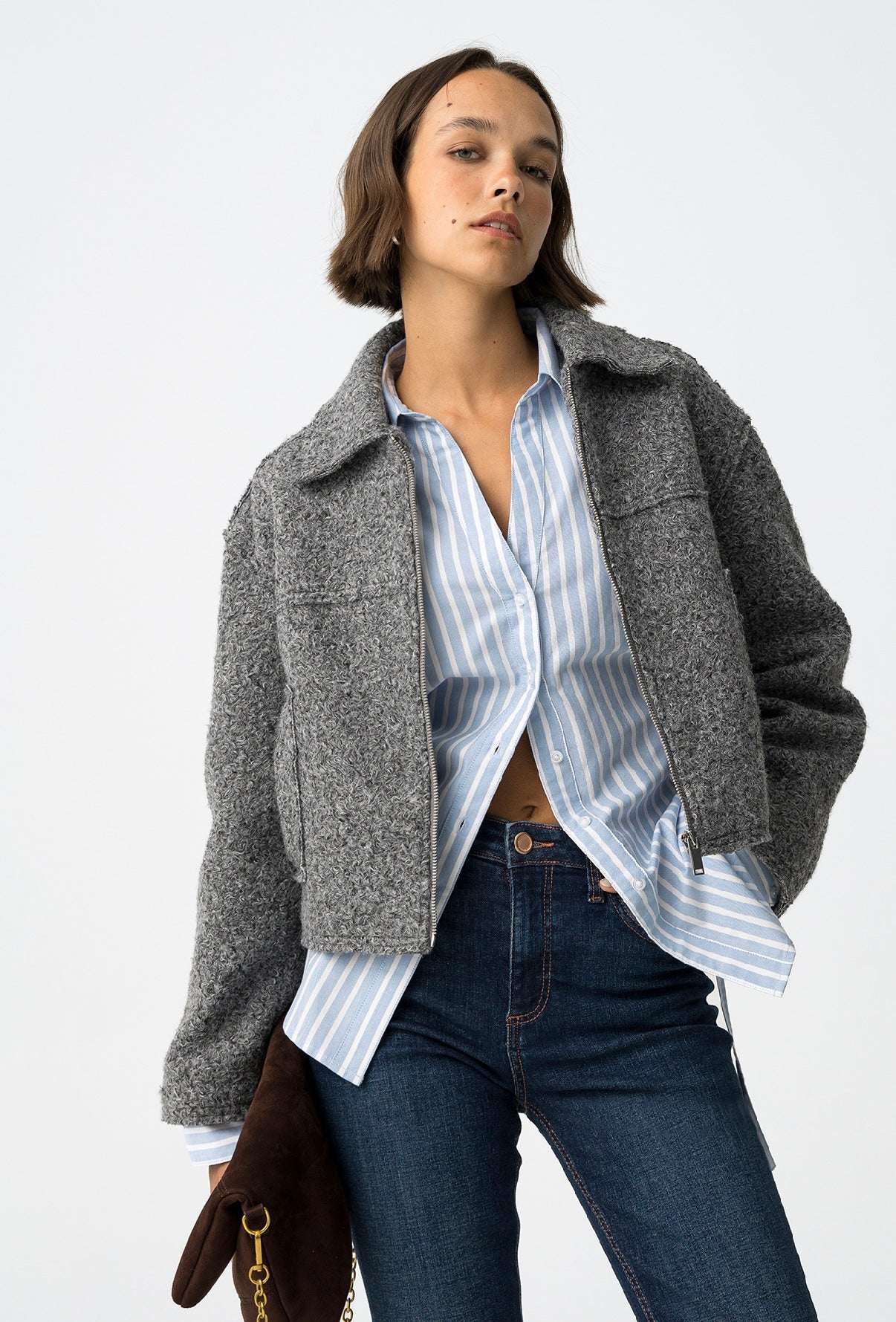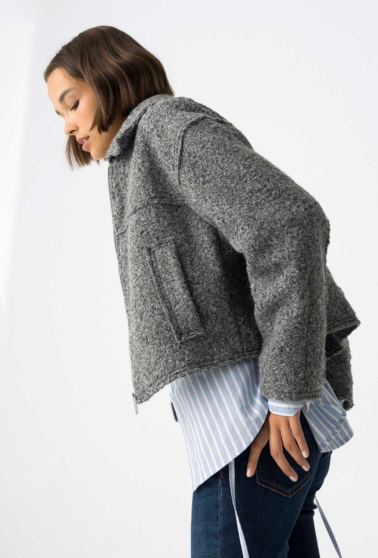 Giacca corta boucle’ dalla vestibilità rilassata, con due tasche frontali a filetto. Colletto, chiusura frontale con zip e maniche lunghe.