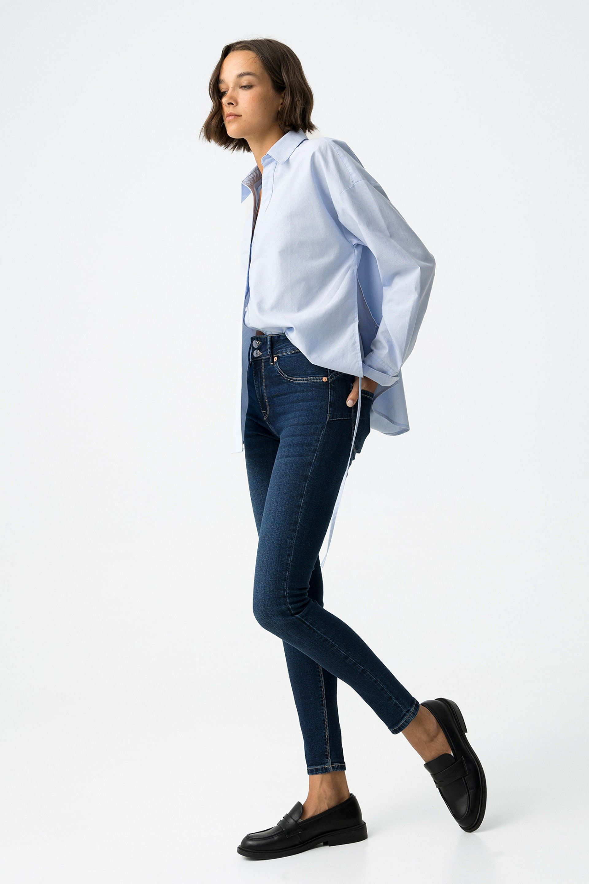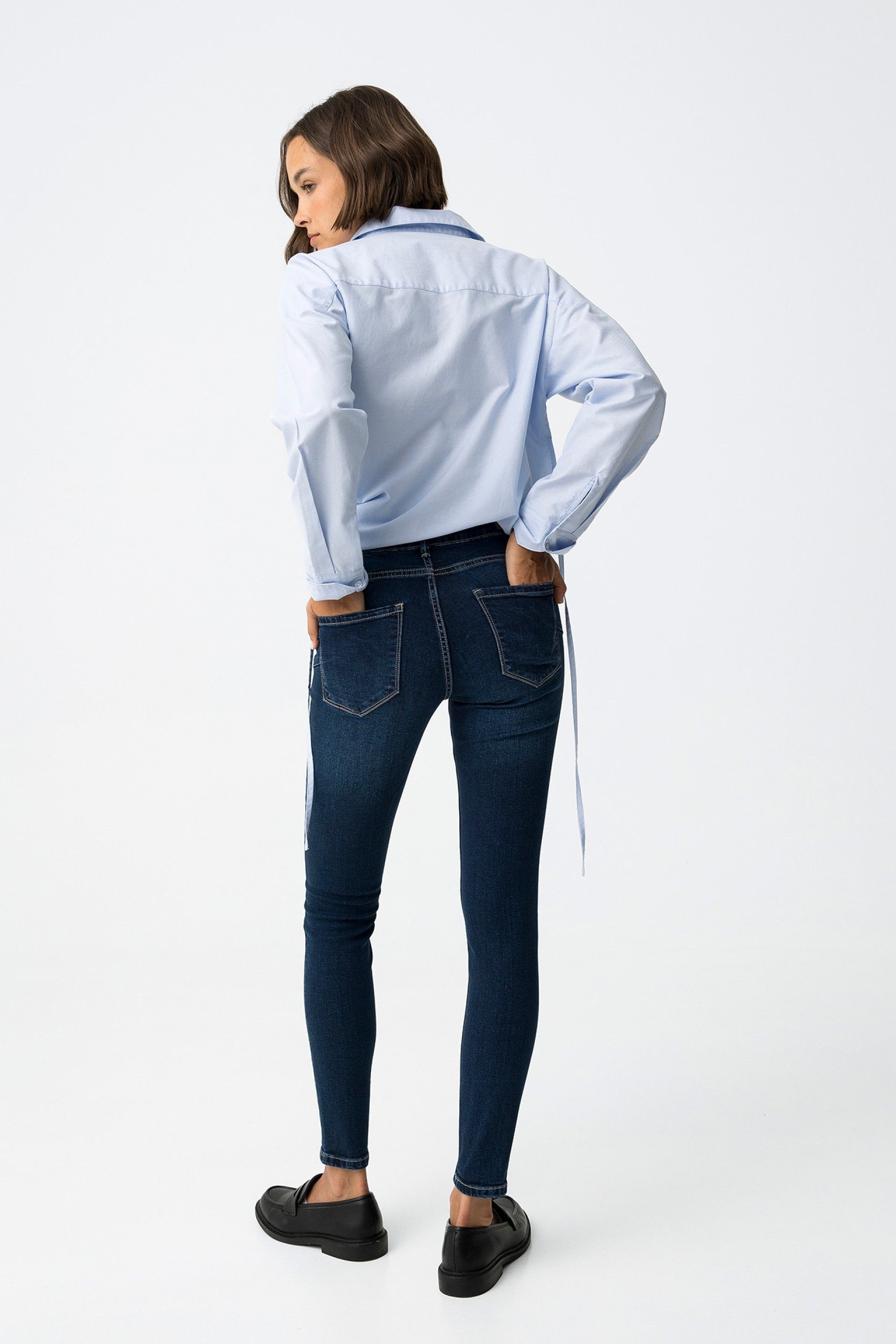 Jeans a vita media con tre tasche.Effetto push up. Chiusura frontale con cerniera e bottoni metallici.Finte tasche sul davanti.
