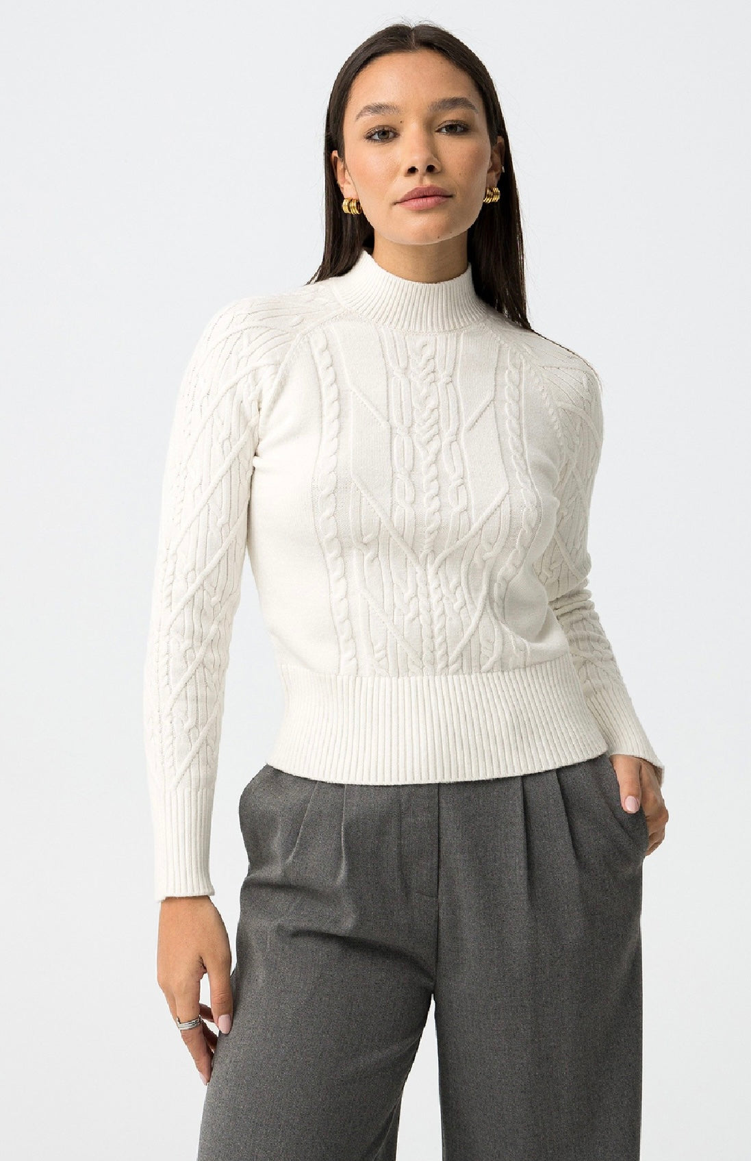 Pullover Tiffosi Alchemy da donna in filato di misto viscosa poliestere e poliammide lavorato rasato e a trecce, a manica lunga raglan, con collo lupetto polsini e cannolè alti a costine