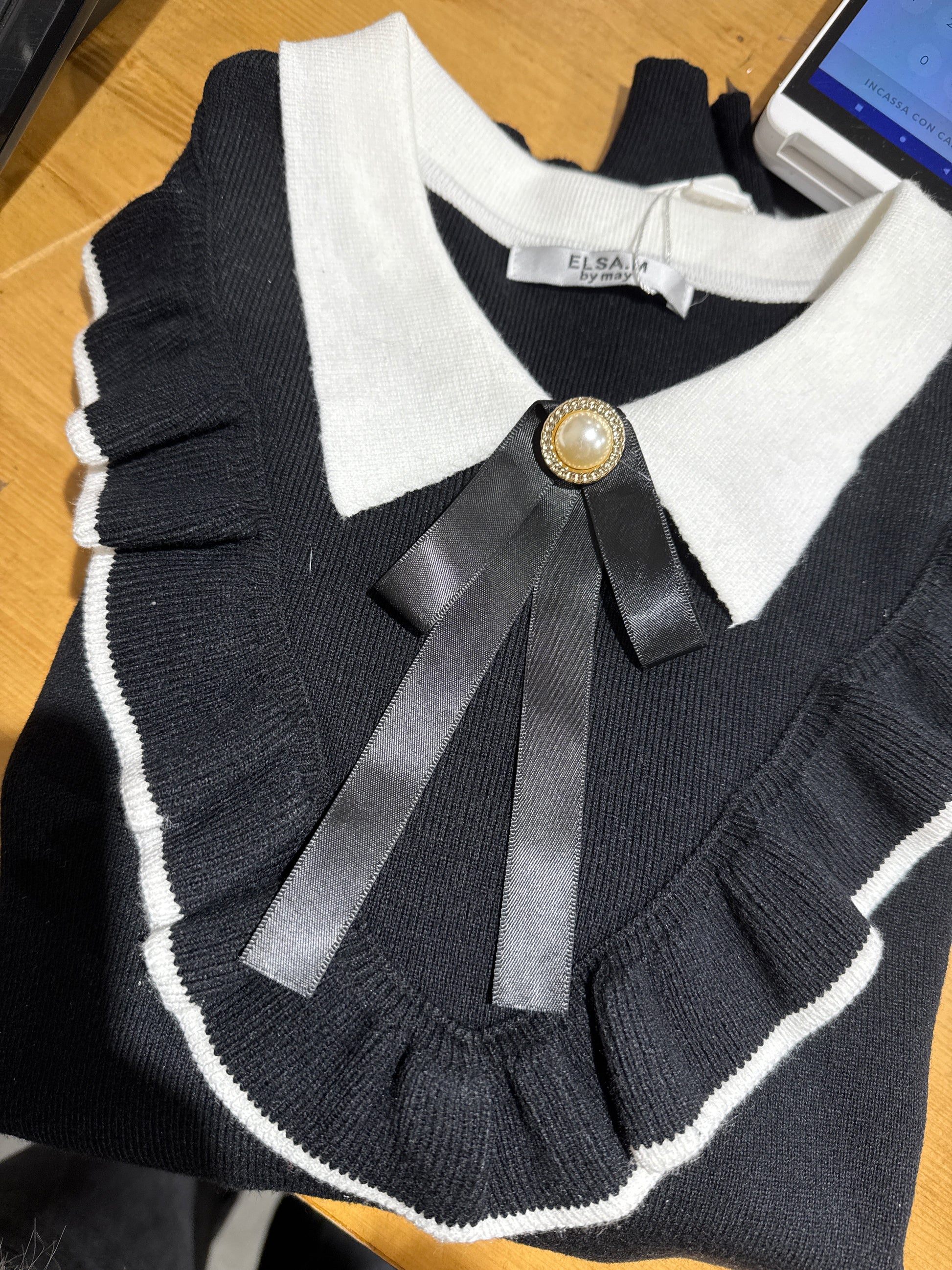 Maglioncino con colletto e spillina.Unico colore disponibile.Tg unica.