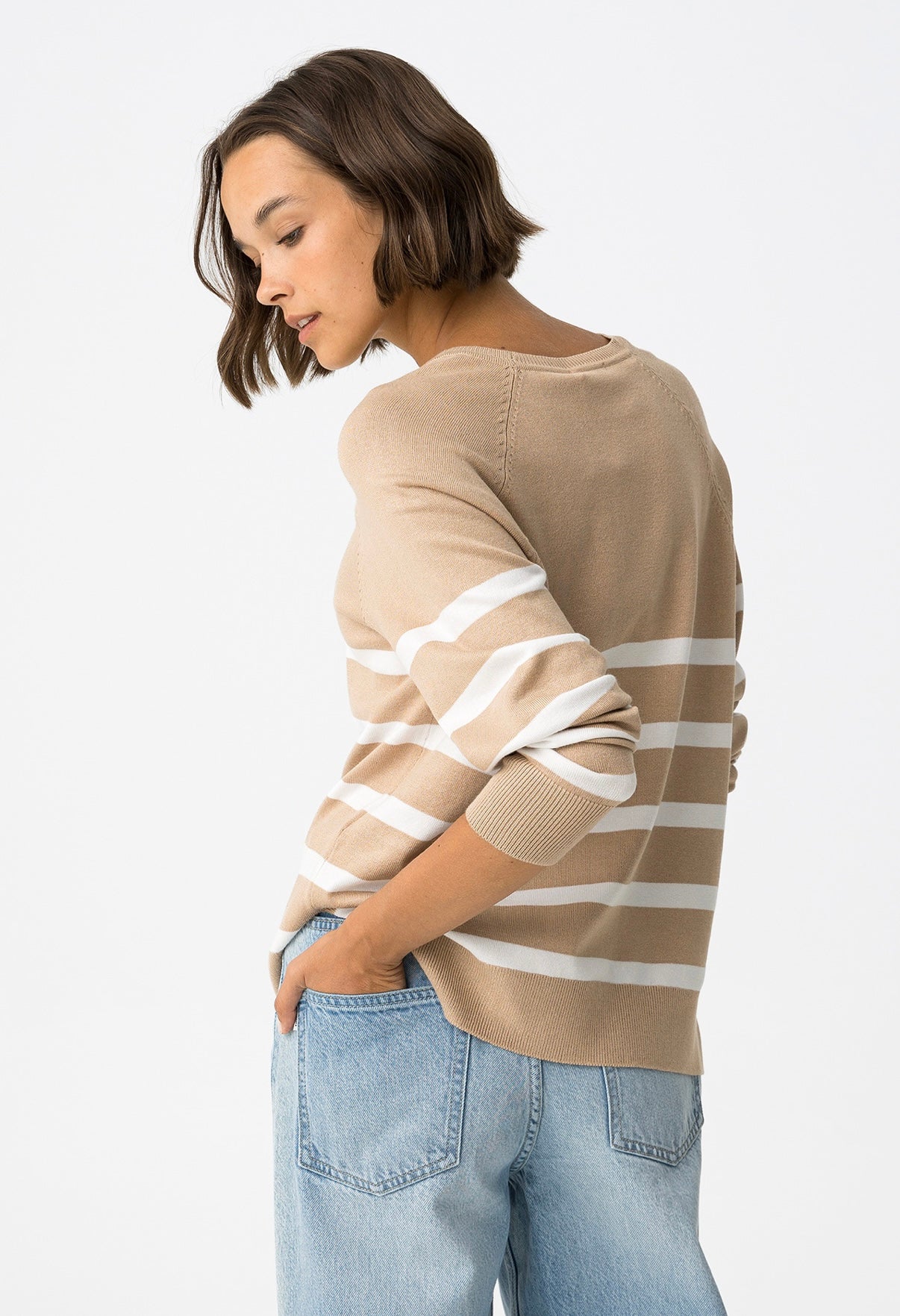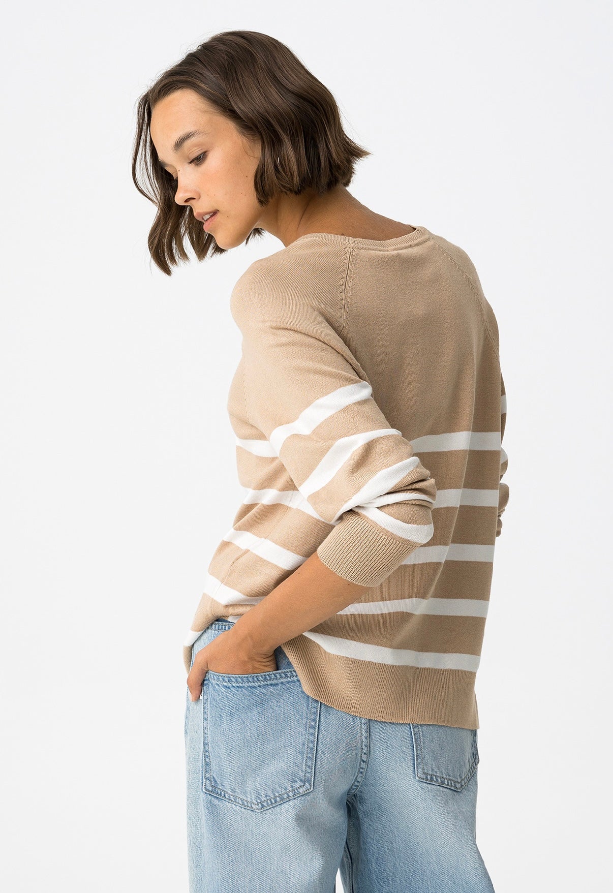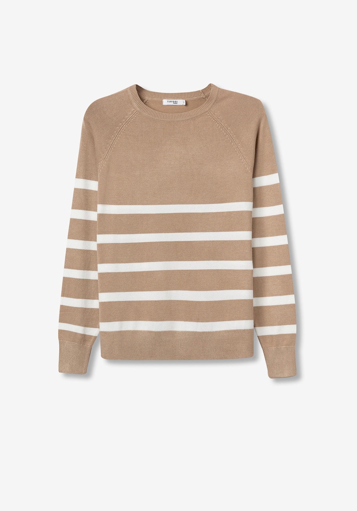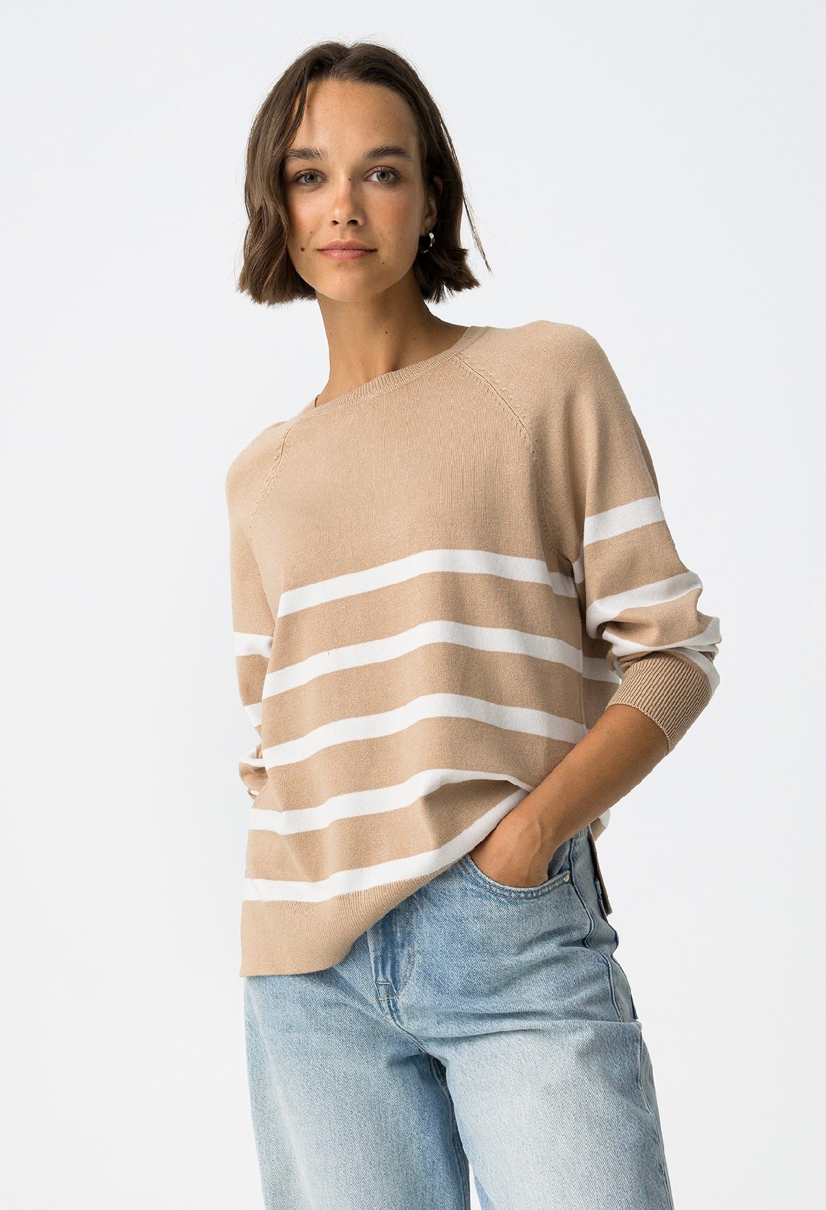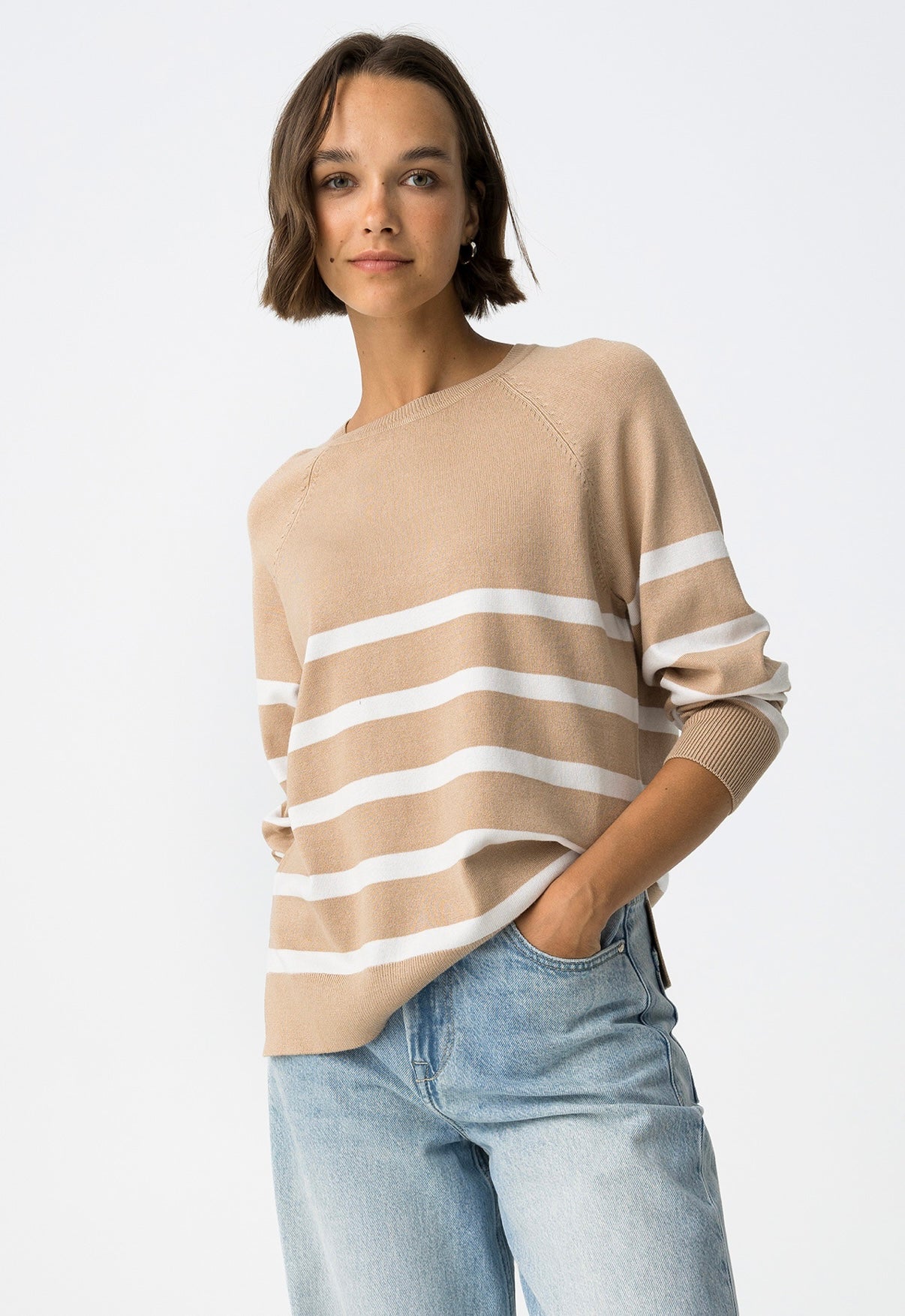 Maglione dalla vestibilità regolare con girocollo, maniche lunghe, spacchi laterali, a righe beige e bianche.