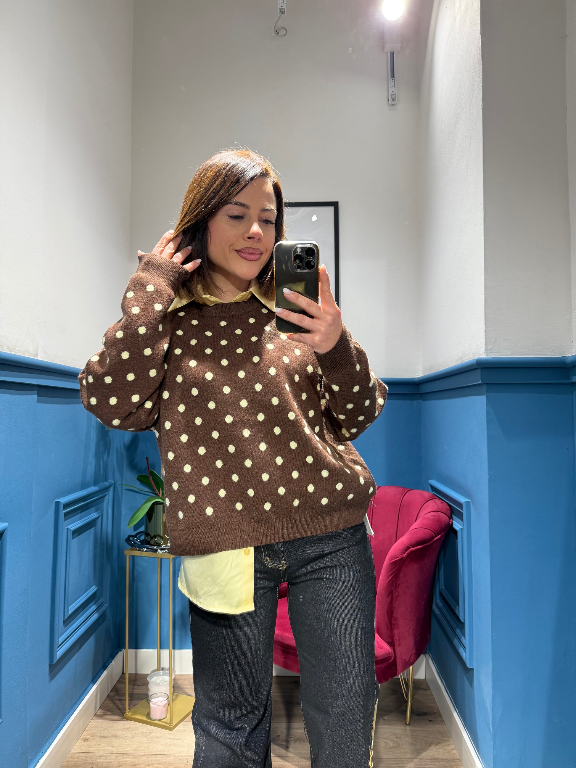 Maglione morbido e casual in marrone caldo con pois color giallino o in panna con pois marroni.Ha una vestibilità comoda, con maniche lunghe e un taglio leggermente oversize che lo rende perfetto per un look rilassato ma curato. Tg unica