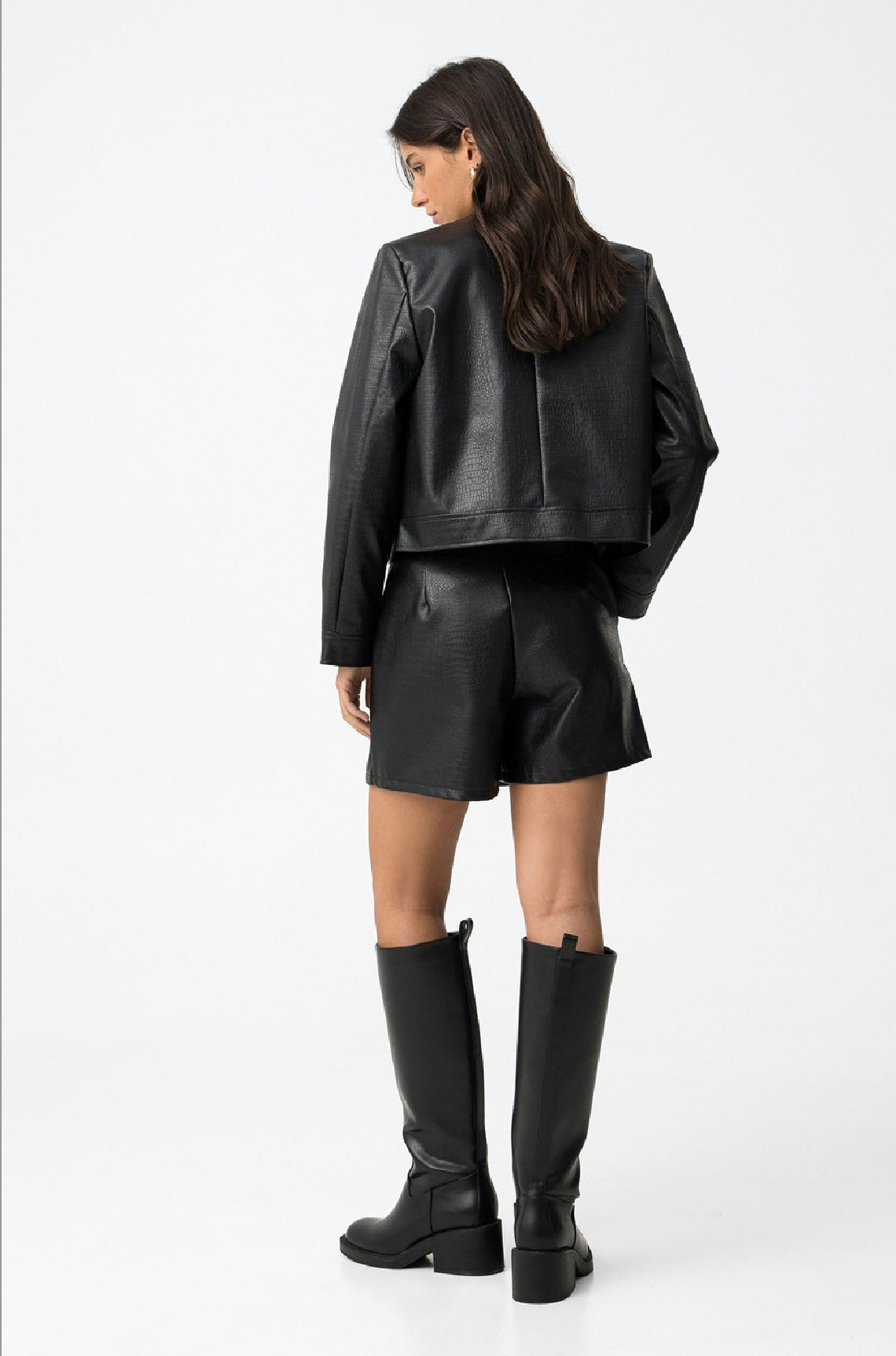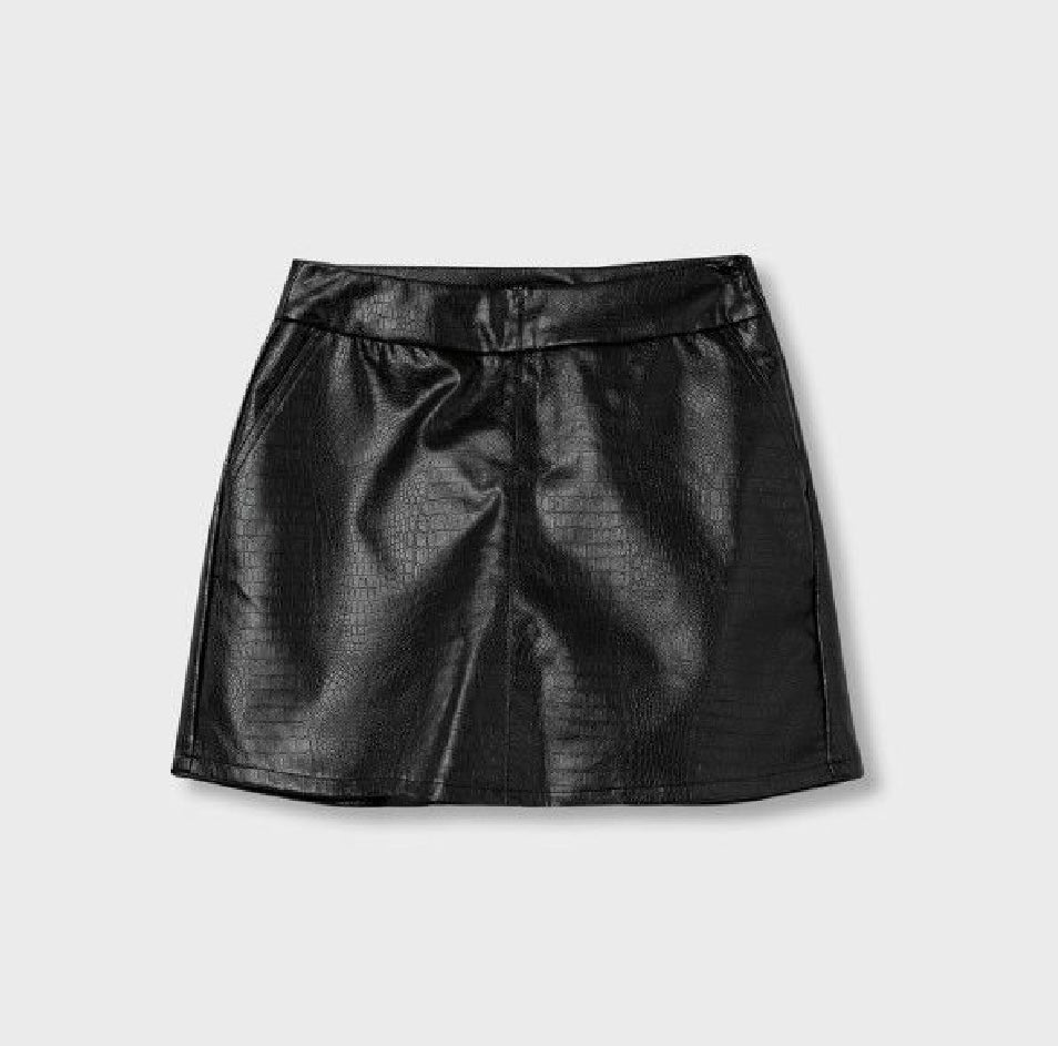 Pantagonna effetto coccodrillo con due tasche frontali e chiusura laterale con zip.