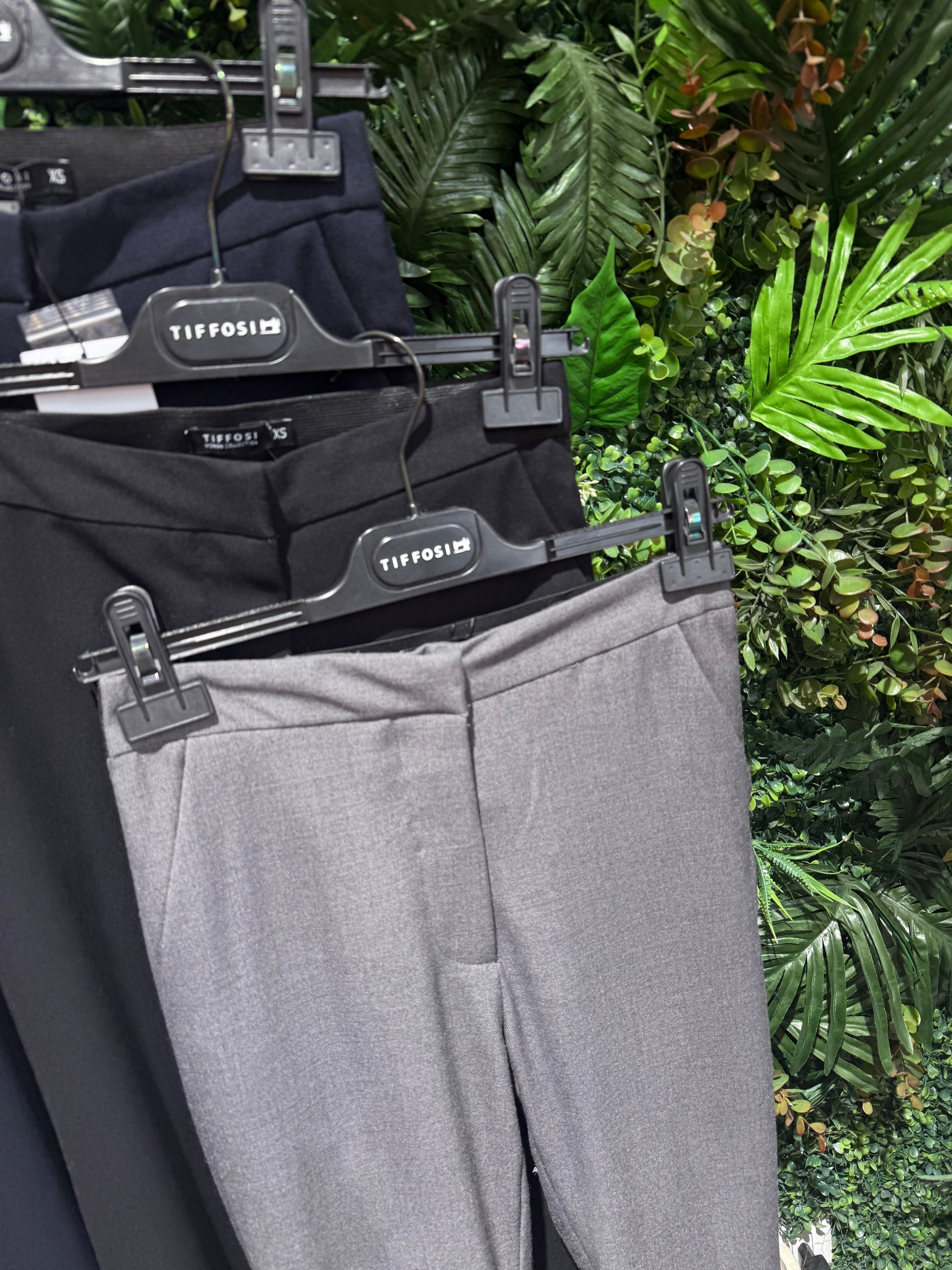 Pantaloni chino in maglia slim fit con due tasche frontali e due tasche decorative a filetto. Cintura elastica alta con zip e ganci interni. Disponibili in nero,blu e grigio.