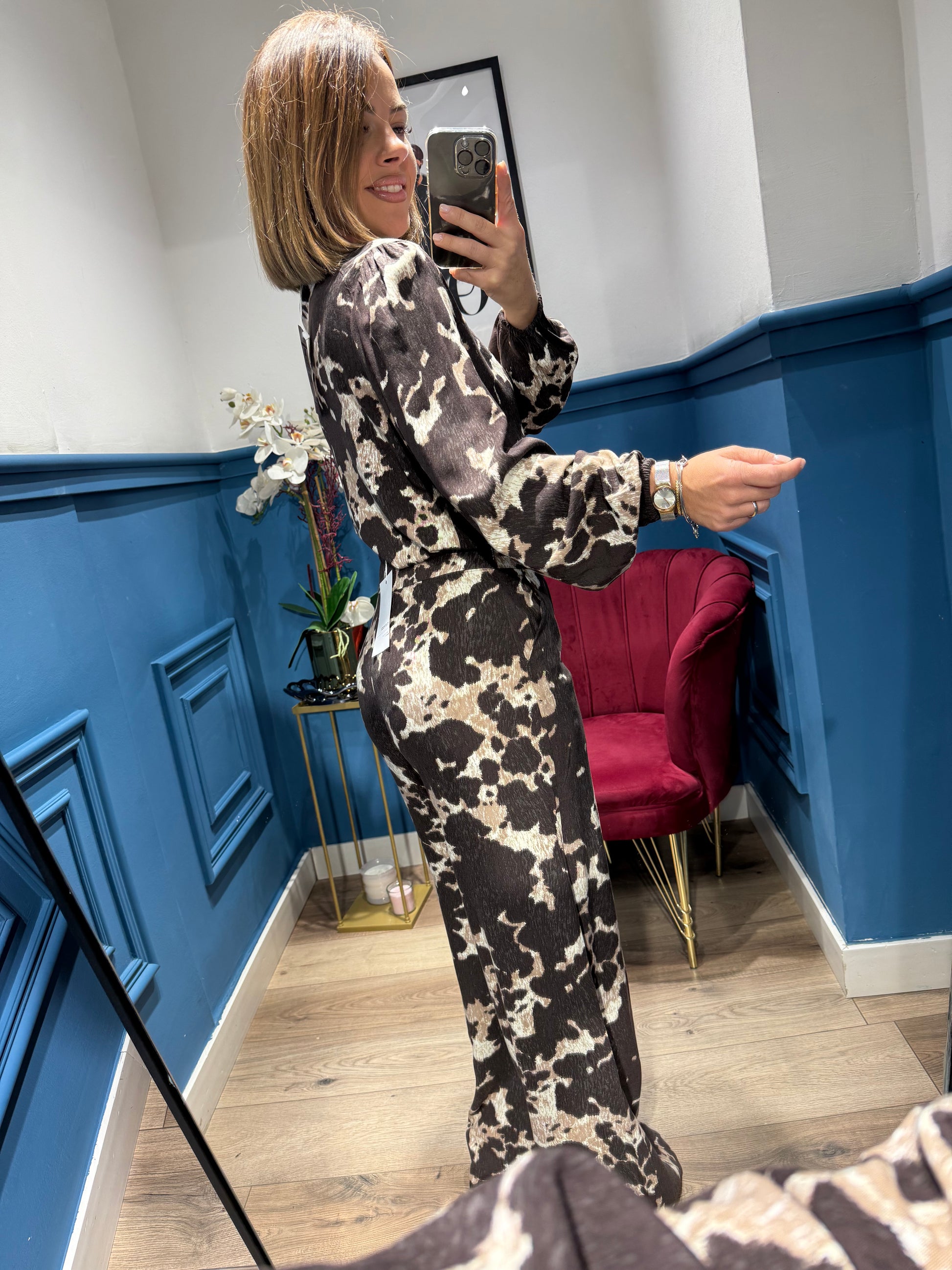 Pantaloni Palazzo con stampa animalier all-over, due tasche frontali e chiusura laterale con zip.
