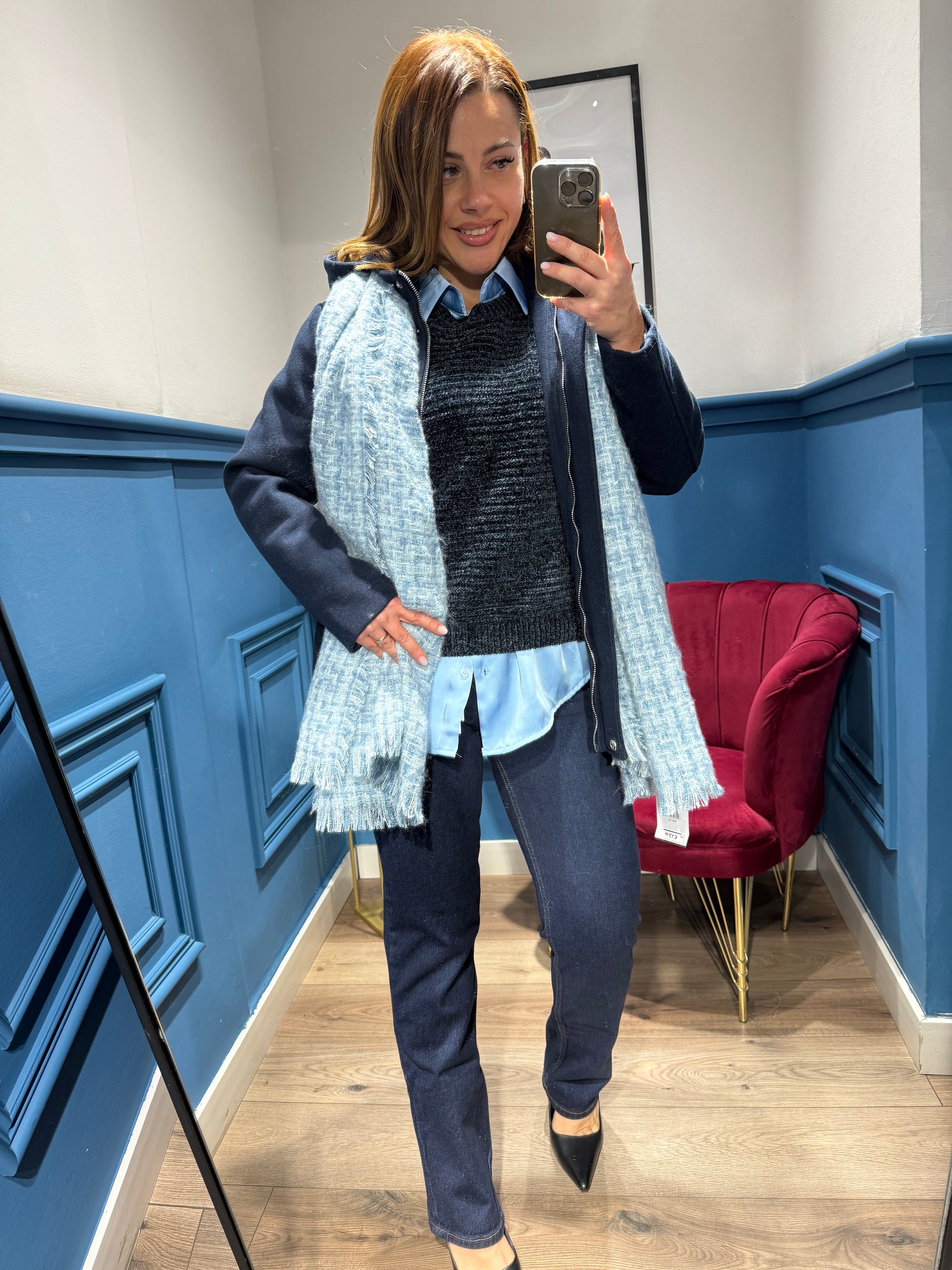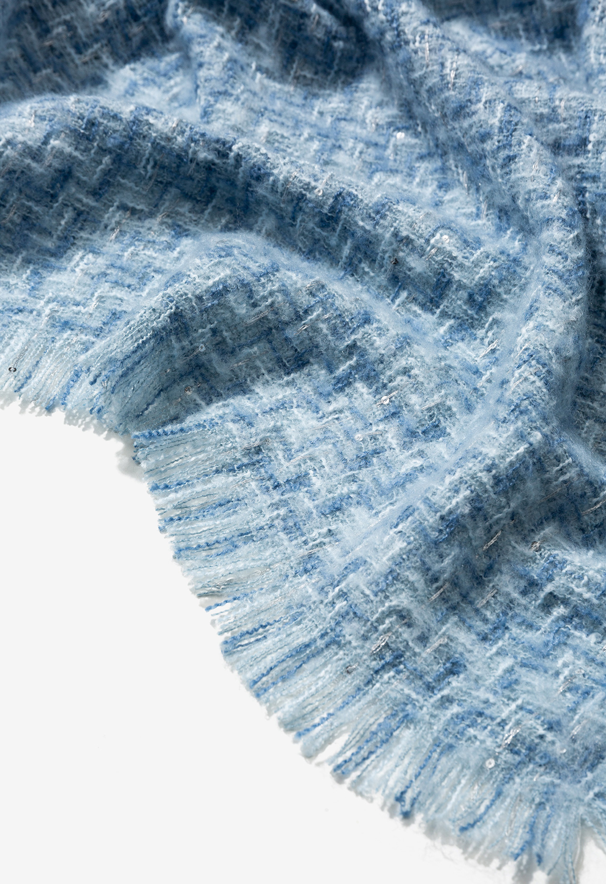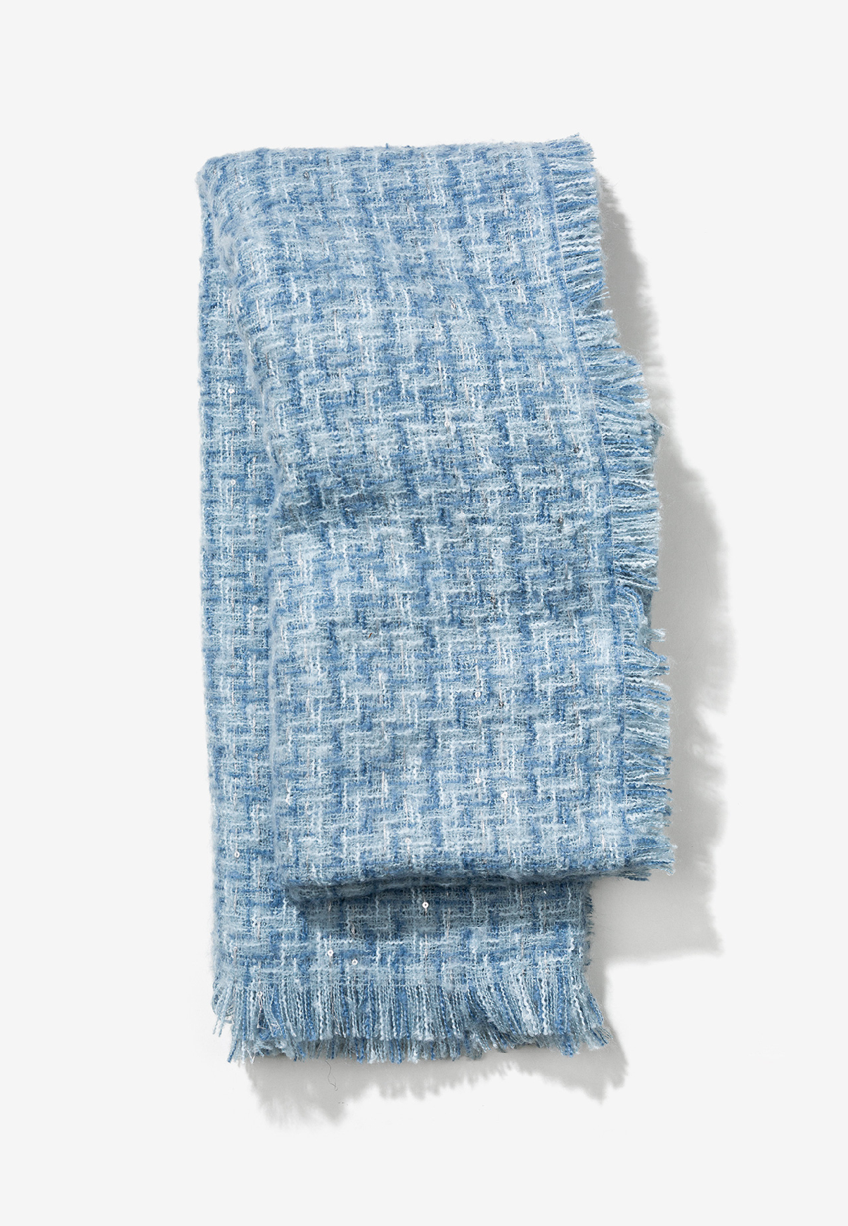 Sciarpa multicolore con dettaglio di filo metallico e frange alle estremità.