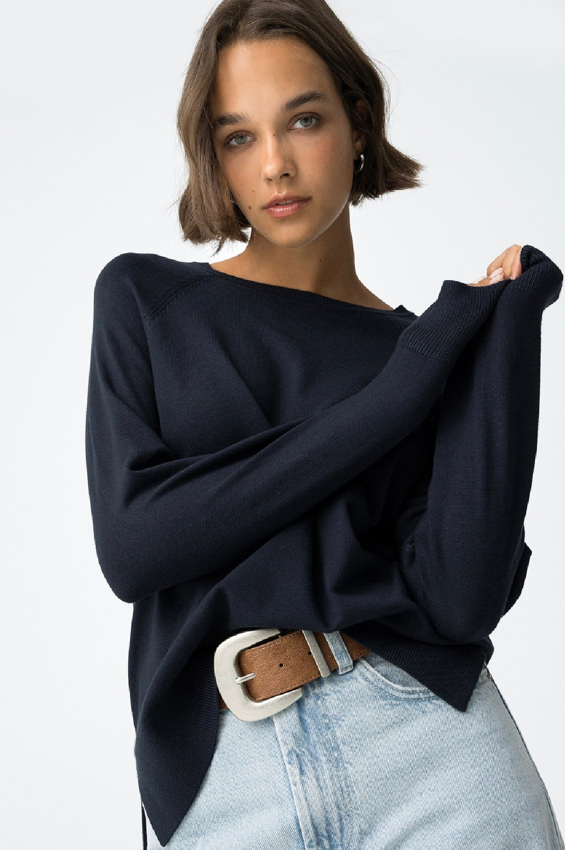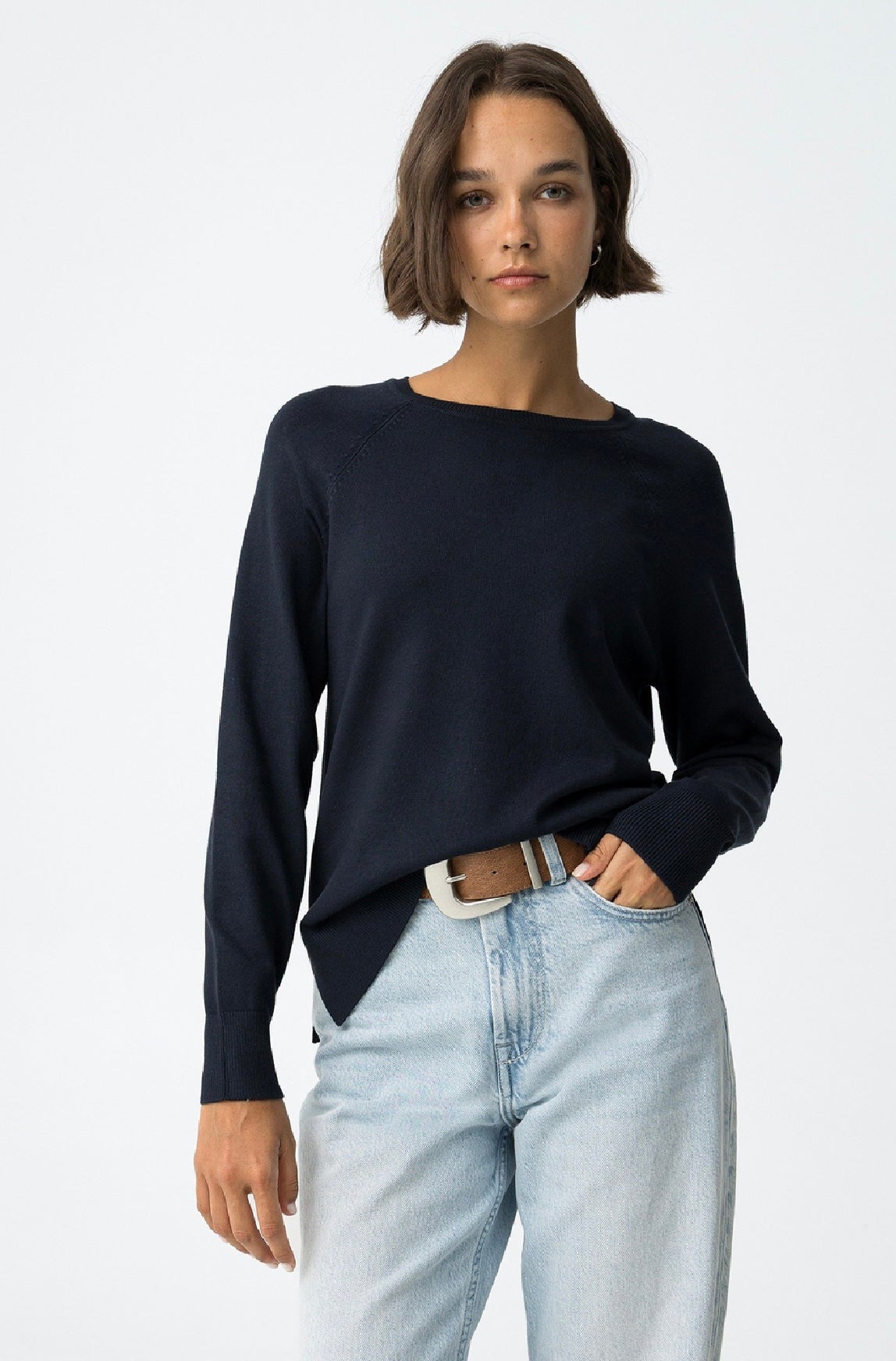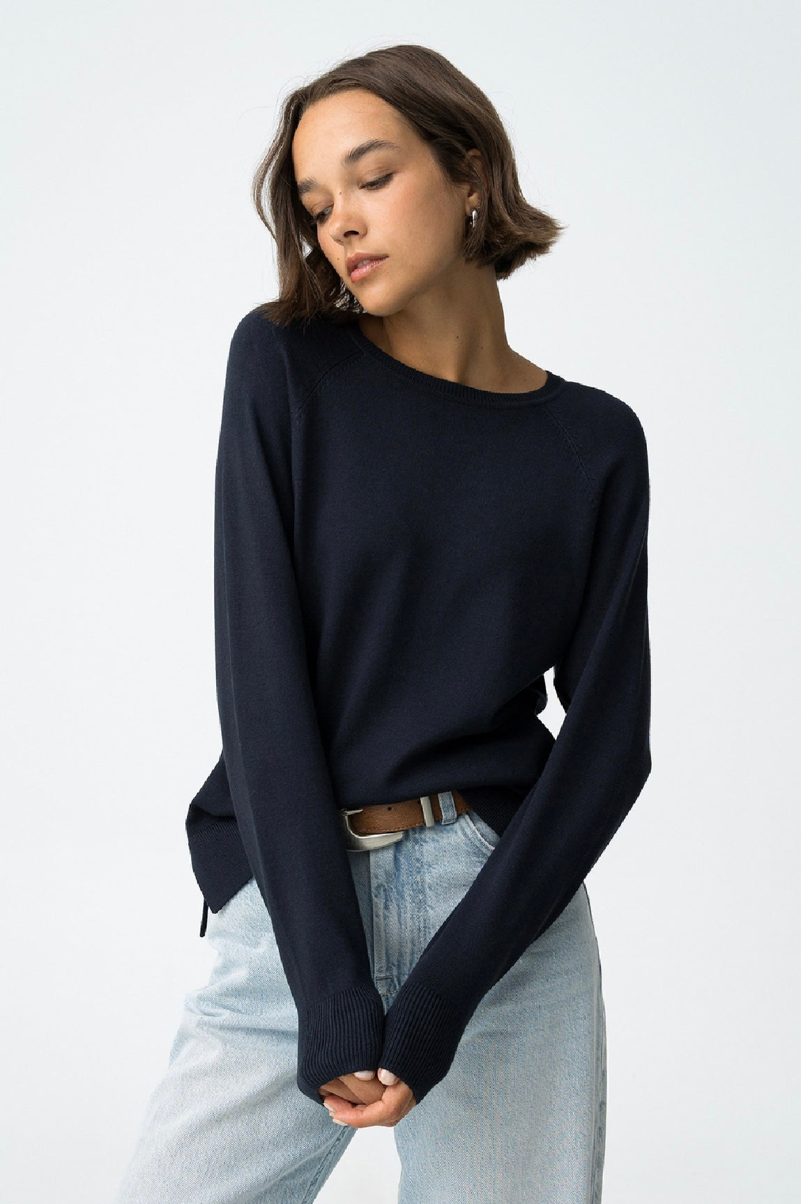 Maglione in maglia semplice dalla vestibilità regolare con scollo rotondo, maniche lunghe raglan e orlo con spacchi laterali. Disponibile in rosso,verde e blu.