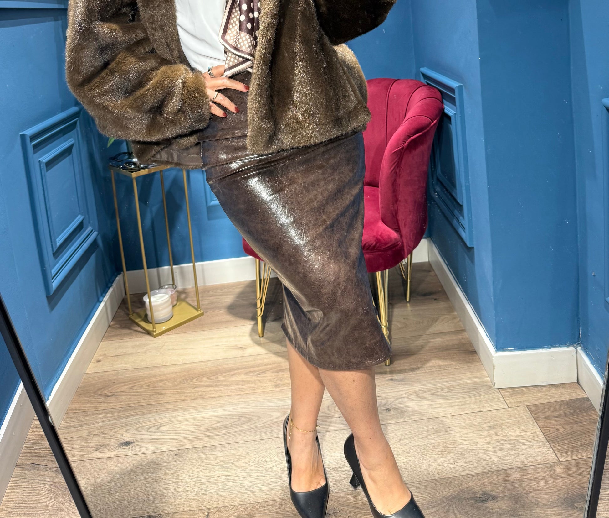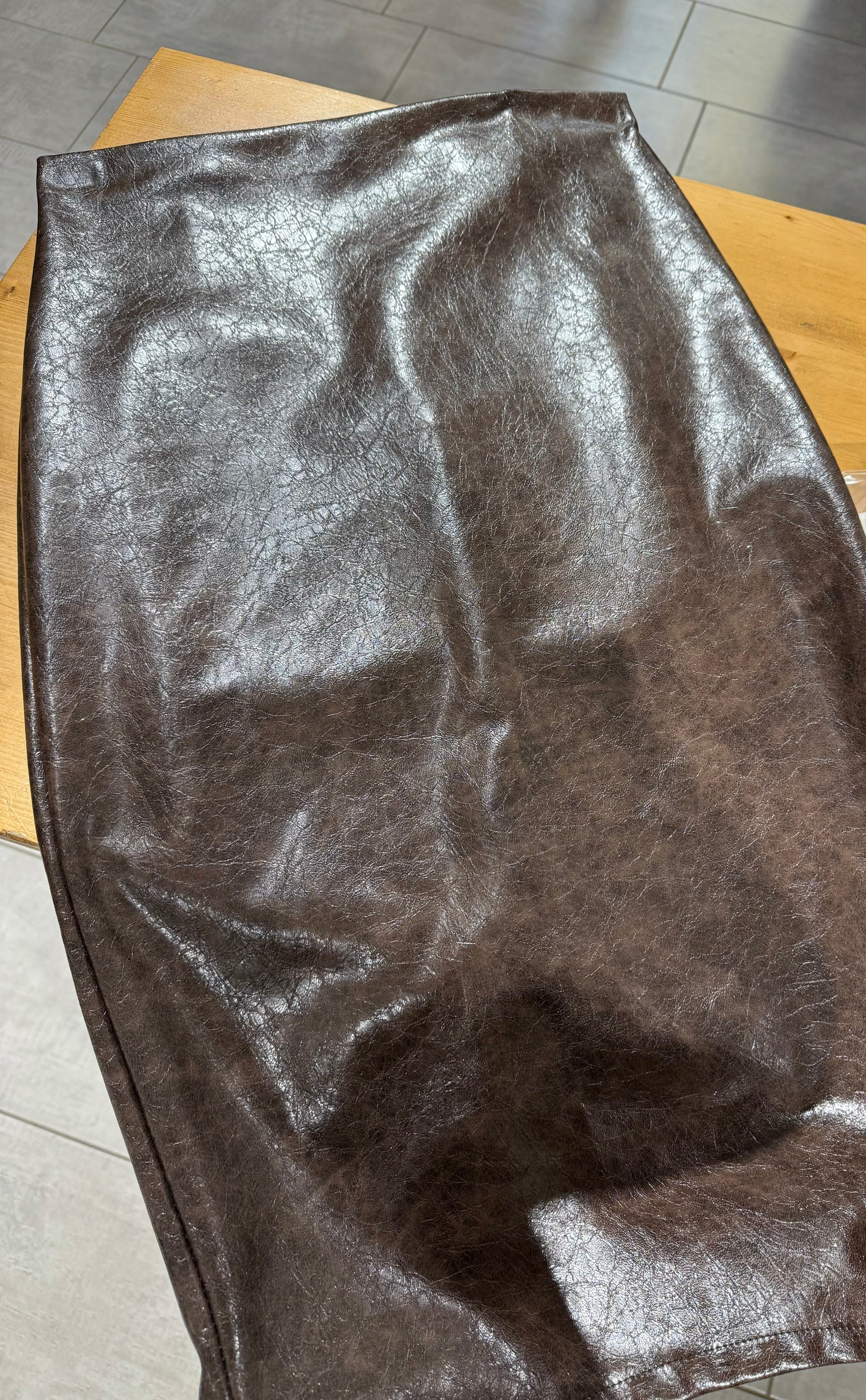 Gonna a tubino martellata con spacchetto posteriore disponibile solo in marrone.