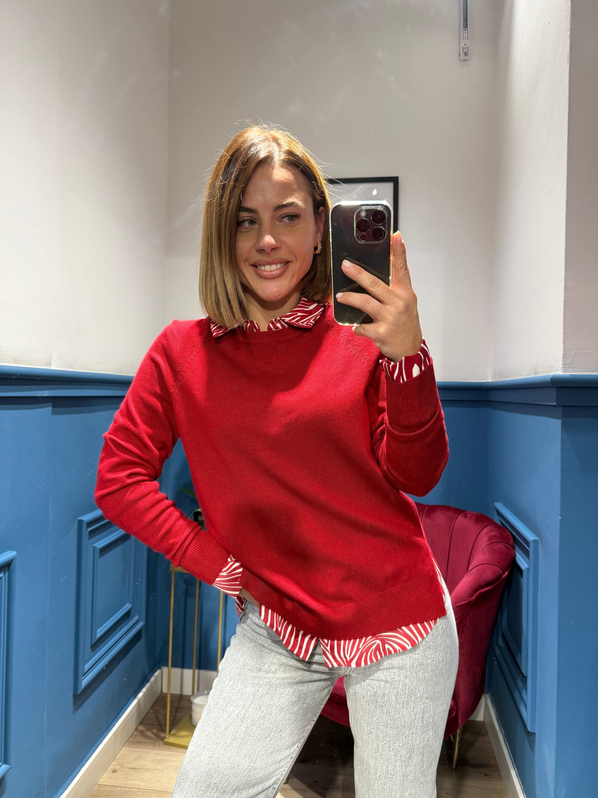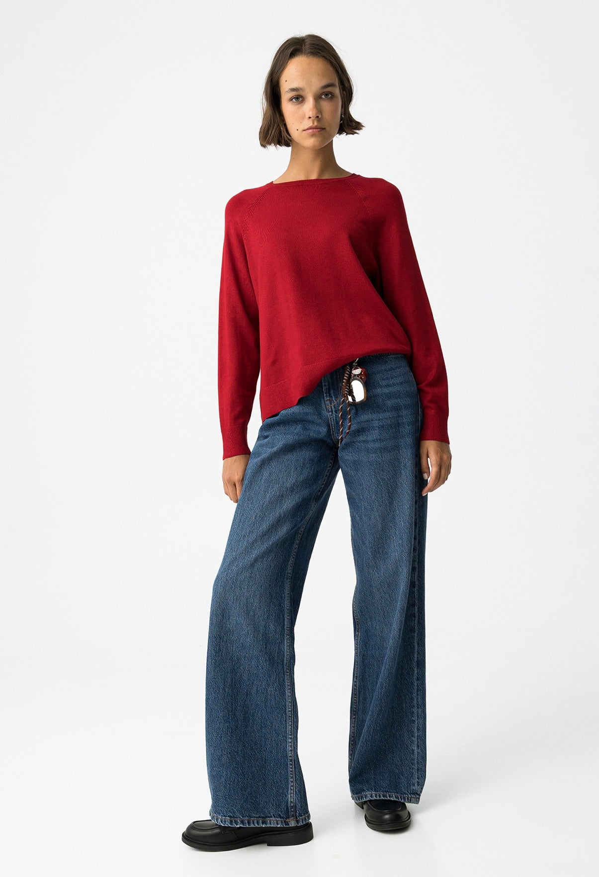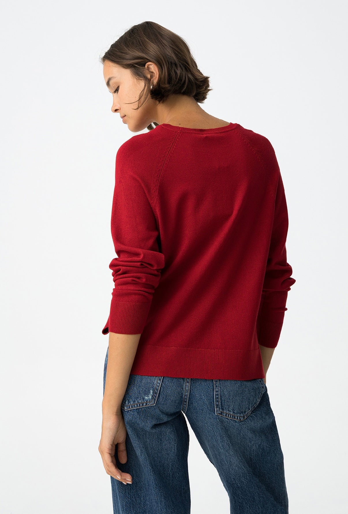Maglione in maglia semplice dalla vestibilità regolare con scollo rotondo, maniche lunghe raglan e orlo con spacchi laterali. Disponibile in rosso,verde e blu.