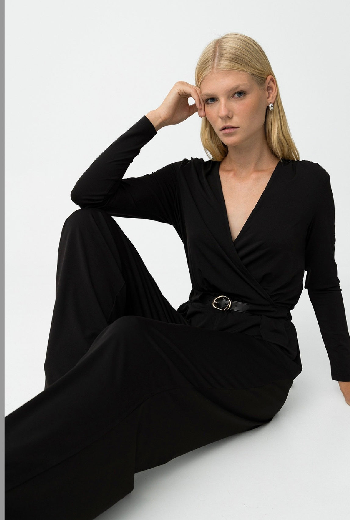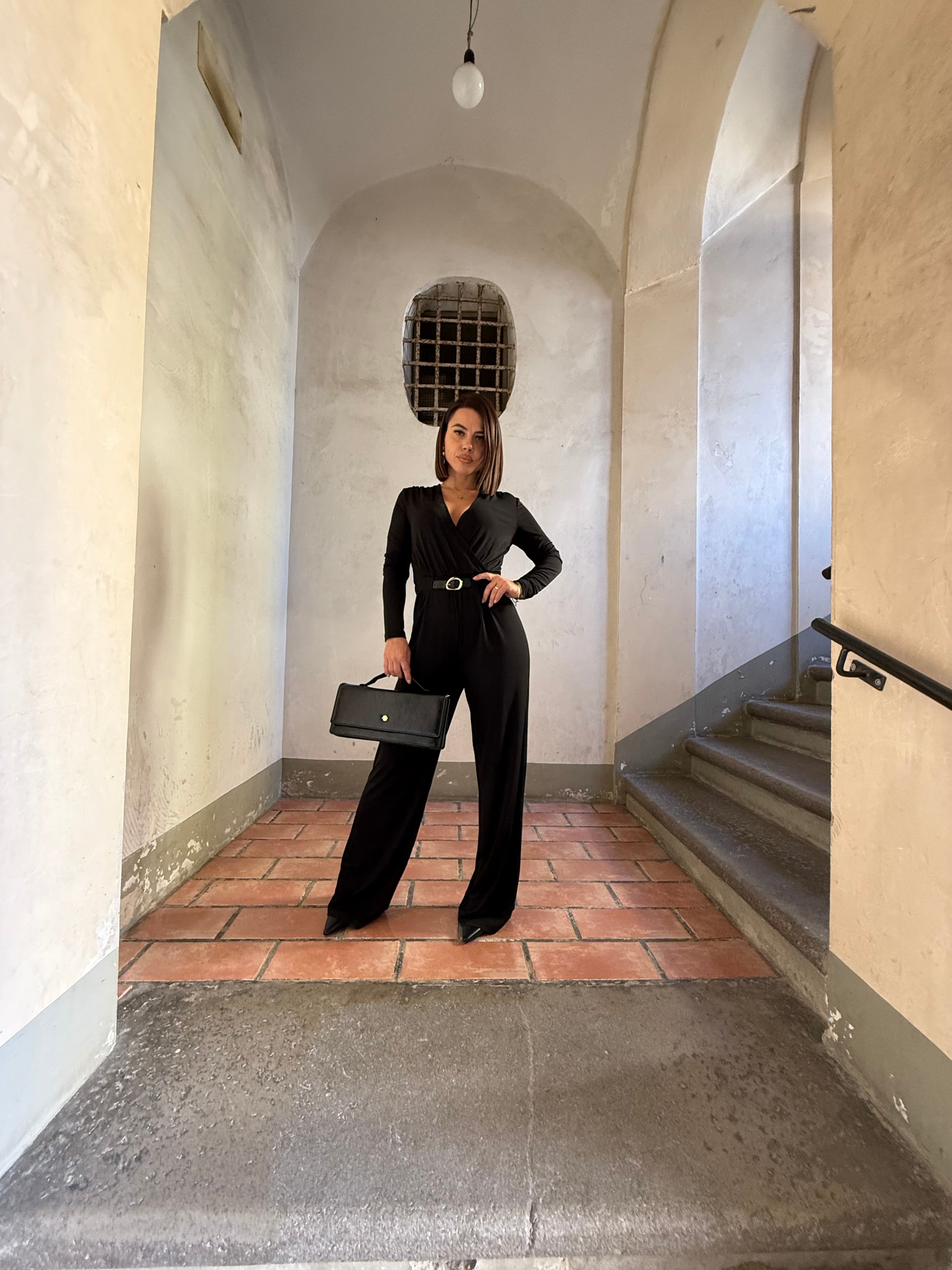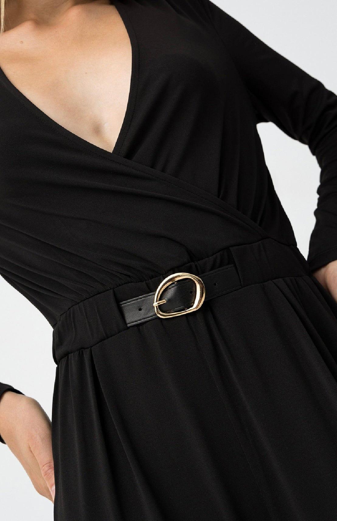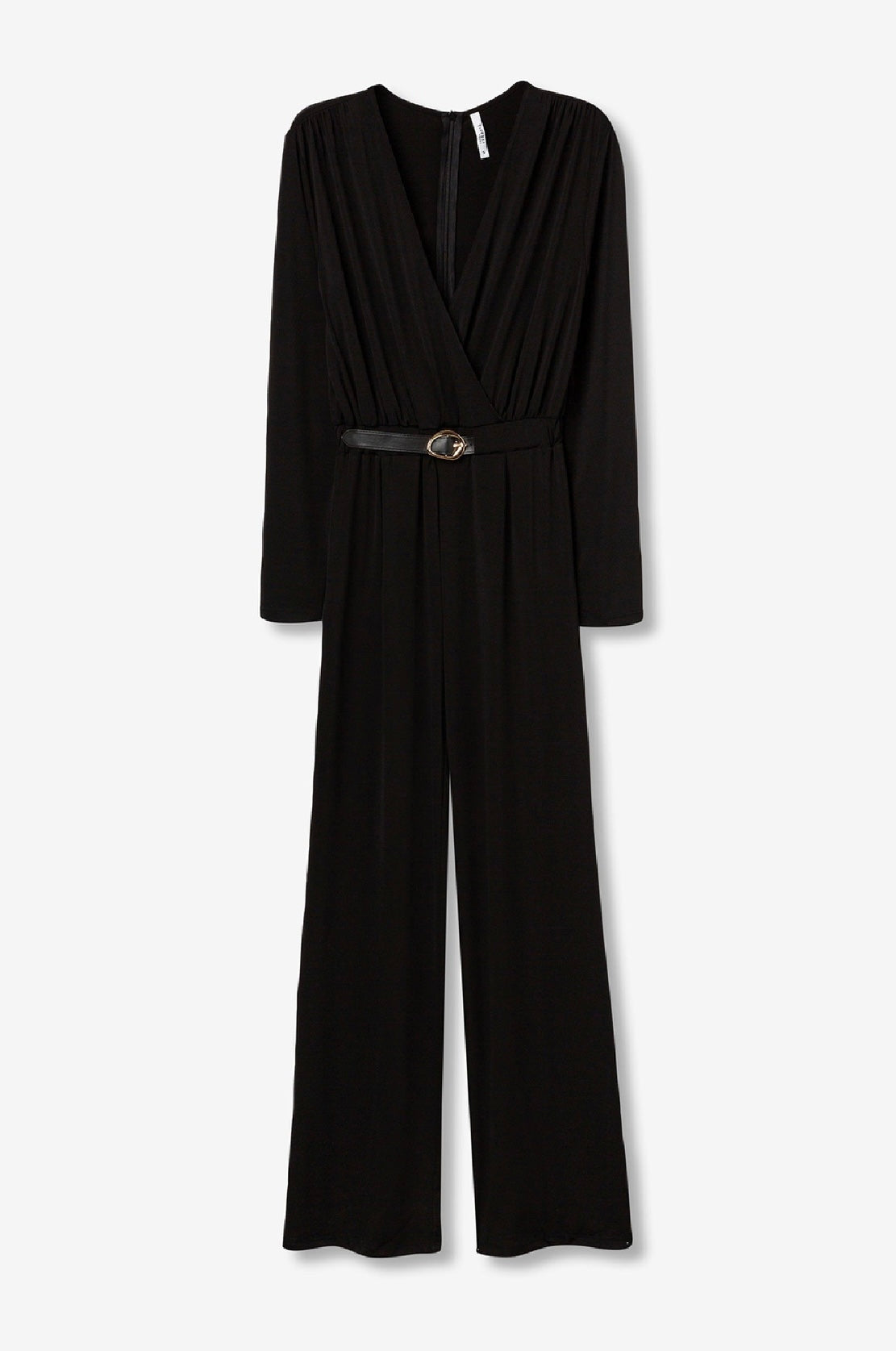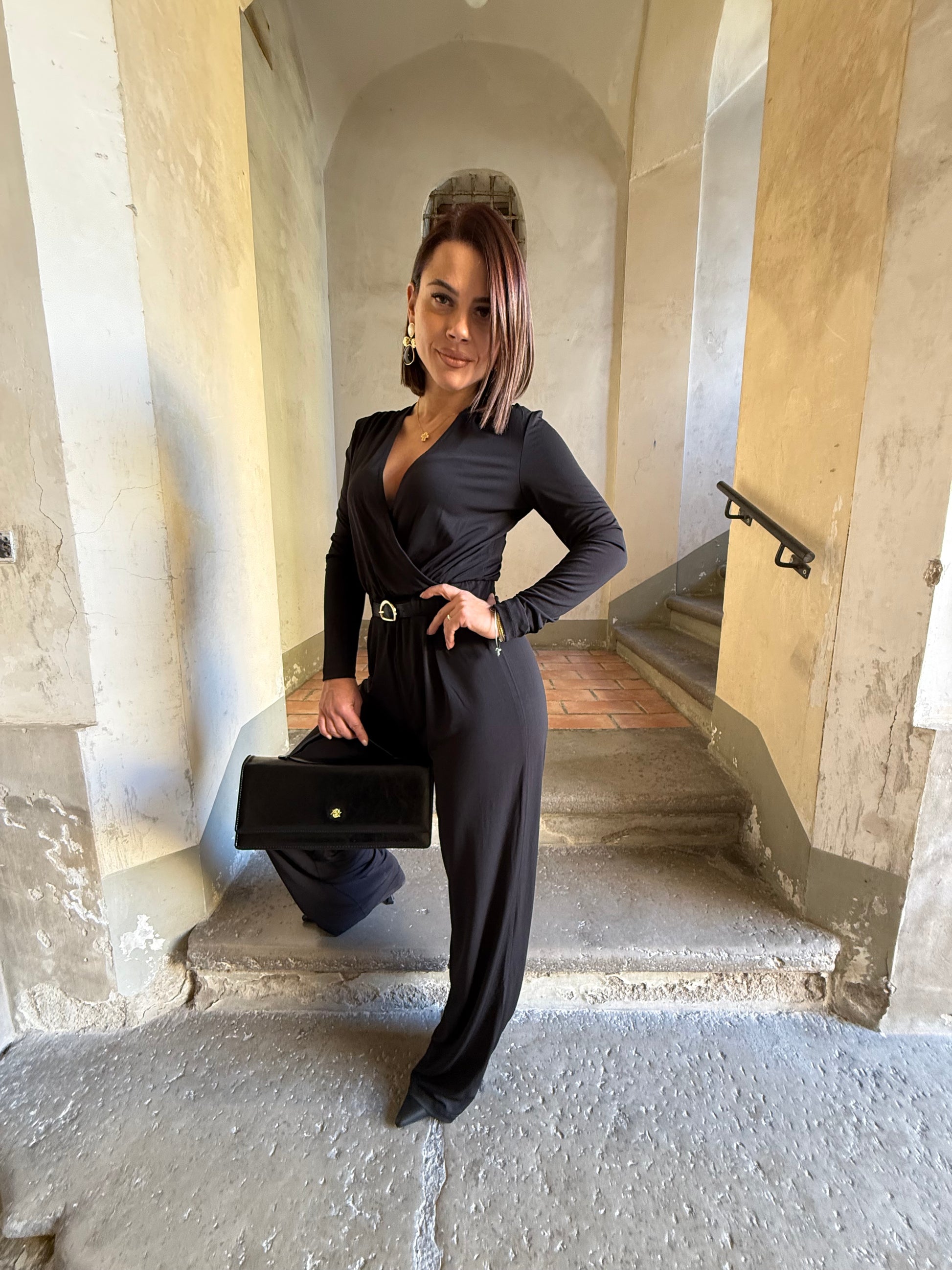 Tuta tessuto elasticizzato con cinturino in ecopelle con placchetta color oro incluso.