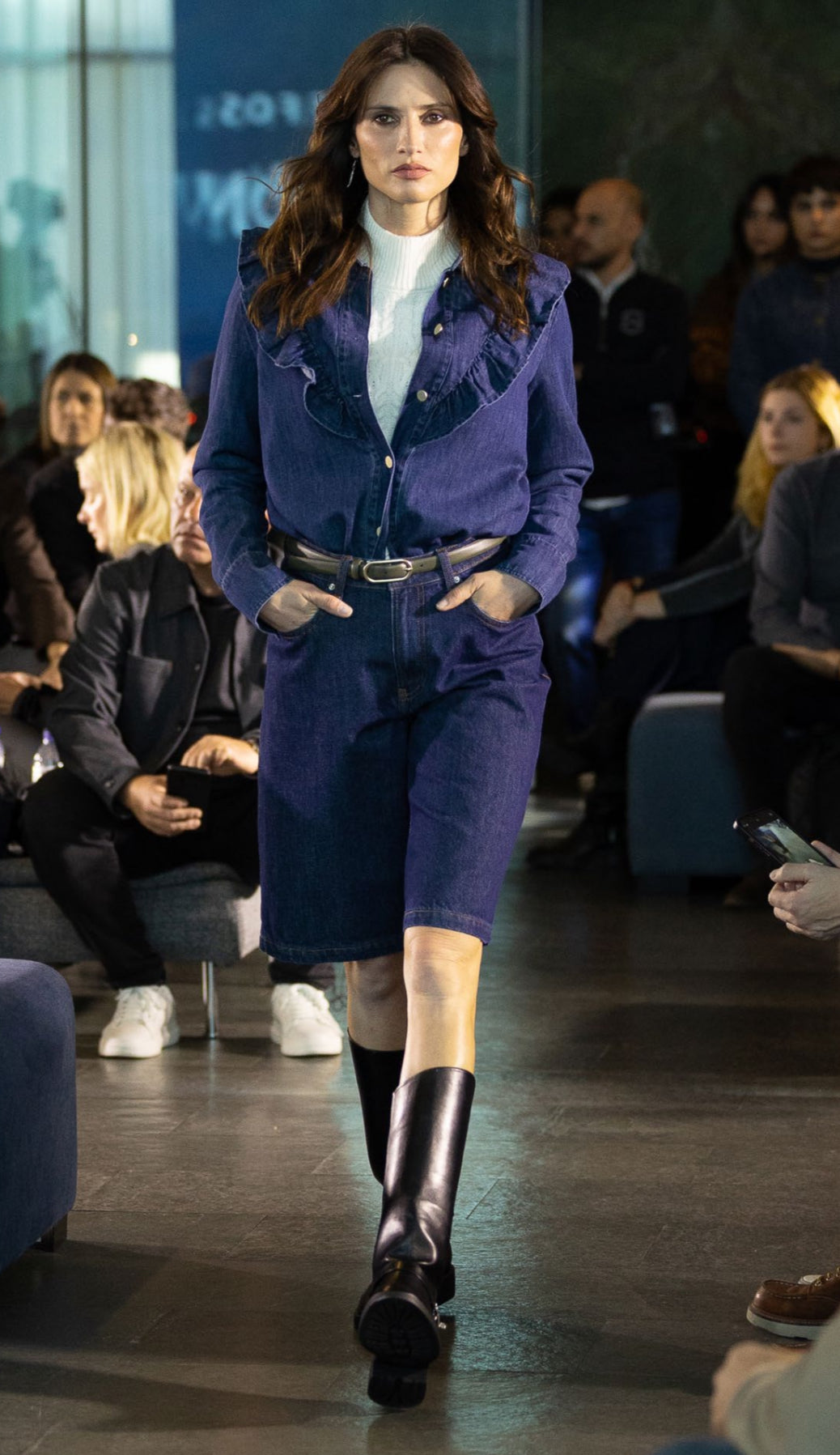 Camicia a maniche larghe in denim con collo a risvolto. Chiusura frontale con bottoni metallici. Dettaglio di volant applicati dalla spalla al petto. Pugni con finale semplice.